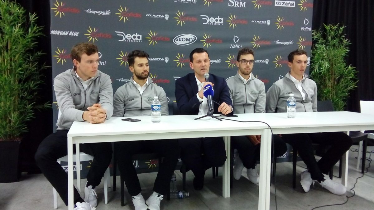 Ploegvoorstelling Cofidis 2018. Je herkent Bert Van Lerberghe en Nacer Bouhanni, maar natuurlijk ook speerpunt Jesús Herrada (2e van rechts). Foto: Simon Dekaezemaker.