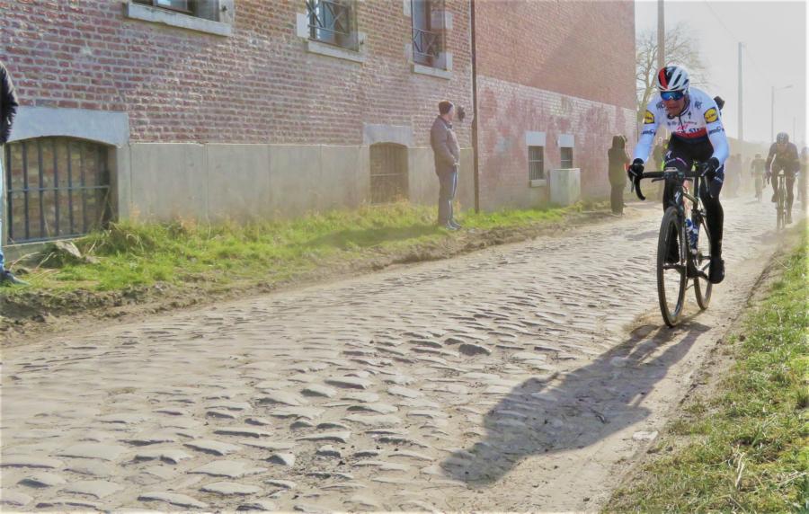 En dan, na dat leesuurtje passeert de 1e politiemotor, het sein om jas, muts, sjaal en handschoenen aan te doen en de auto te verlaten. Ze zijn daar! Het wordt drukker op de Rue de Belle Vue, de echte wielerfan weet dat hij daar moet zijn. Meer en meer vangt onze wielerfan de Nederlandse taal op. Ze zijn paraat, de Vlamingen die gek zijn van de koers. De kopgroep in aantocht, met in hun zog een aantal volgwagens en motards, de bijhorende stofwolk is indrukwekkend. Enkel de lichten van de wagens zien de fans nog aankomen bij het opdraaien van de kasseistrook. Kopgroep gepasseerd, achtervolgende groep gepasseerd en peloton raast ook voorbij.