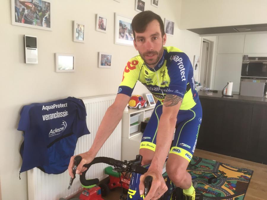 “Ik gebruik op de rollen al een tijdje het programma Zwift en dat staat nu in de garage. Dan zet ik de poort een meter omhoog voor ideale ventilatie, maar binnen is het natuurlijk plezanter. Er is boven al een kamer voorzien voor mijn fietsspullen en ook voor mijn rollen, maar ik zie het niet zitten om mijn fiets elke keer naar boven te sleuren. Bovendien krijg je na 3 uur op de rollen wel serieuze geurhinder en op den duur ook vochtplekken op de muren.”