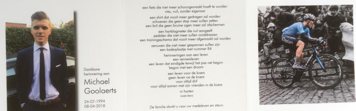 Van Belgisch bondsvoorzitter Tom Van Damme tot Tourbaas Christian Prudhomme, van Lottochef Marc Sergeant tot gewezen bondscoach Wilfried Bomans. Van zijn manager Jef Van den Bosch tot zijn vaste fysiotherapeut Tim Aerts. Van collega’s Joeri Calleeuw en Brecht Ruyters tot gewezen ploegmakkers Milan Menten en Robbe Ghys. Ondanks het lopende koersseizoen zat de kerk afgeladen vol en ook buiten was er een kleine mensenmassa opgedaagd. Michael Goolaerts was dan ook een heel geliefd gezicht in de koers en ver daarbuiten.