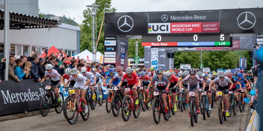 Start in Albstadt, waar Tauber heel wat plaatsen moet goedmaken. Je ziet haar ergens in het midden op de 3e rij in de Nederlandse kampioenentrui. Foto: Sigel/ EGO Promotion.