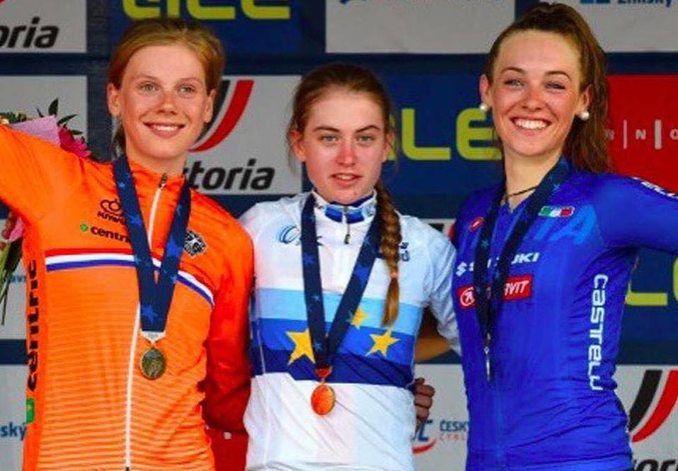 Zaterdagmiddag knalde Aafke Soet naar de zilveren medaille op de Europese kampioenschappen in het Tsjechische Zlin. Met 3 jongedames waren ze erg dominant, reden ze alleen weg. Soet met de Duitse Klein – die ze eerder al in de tijdrit had geklopt – en de Tsjechische Nikola Noskova – die in de winter crosst bij het Vondelmolen-team onder de vleugels van Geert Wellens. Noskova was niet te houden, en voor het zilver slaagde Soet erin haar Duitse opponente af te houden.