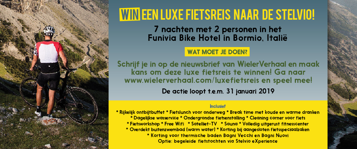Sinds de zomer van 2018 heeft WielerVerhaal een langetermijnsamenwerking met Funivia, hét Bike Hotel in Bormio. En dus mogen we jullie een luxe fietsreis cadeau doen voor 2 personen. Dat is 8 dagen lang fietsplezier van de bovenste plank. Droom maar al van de Stelvio, Gavia, Mortirolo, de Umbrailpas, het prachtige meer van Cancano, en nog veel meer van dat lekkers. Vlakbij gaat trouwens zowat het hele peloton op trainingsstage in Livigno.