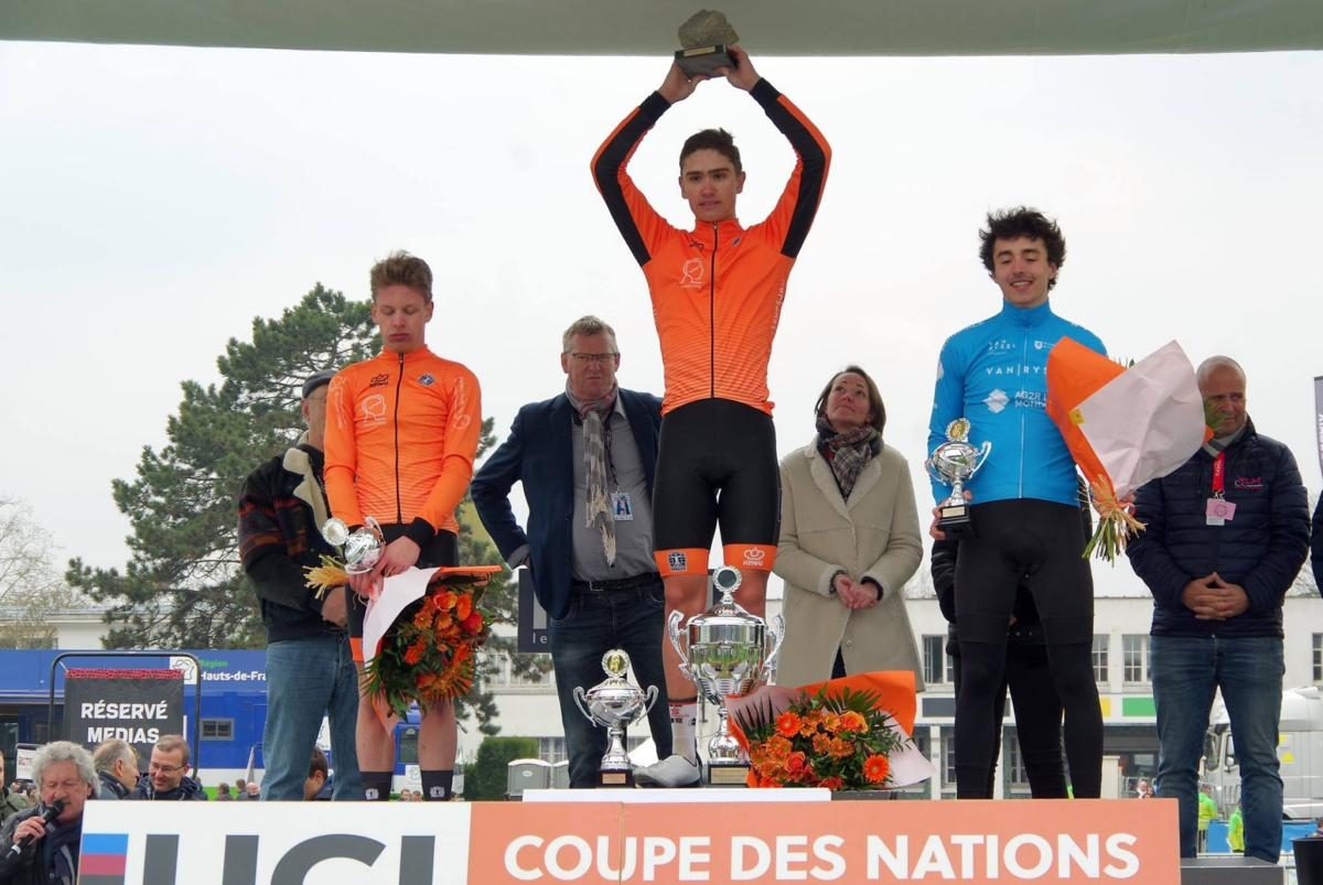 Hidde van Veenendaal reed eerder op het seizoen top 10 in Kuurne-Brussel-Kuurne en vorige week nog top 20 in de Ronde van Vlaanderen. Het was met bescheiden ambities dat de 2e jaars junior aan de start stond in Saint-Amand-les-Eaux, waar de junioren hun koers op gang trokken. “Het doel was om na de voorbije koersen een verlengstuk te breien aan de mooie resultaten e andermaal ene stevige performance neer te zetten”, blikt Van Veenendaal uitgeput terug, nauwelijks enkele minuten na zijn triomf.