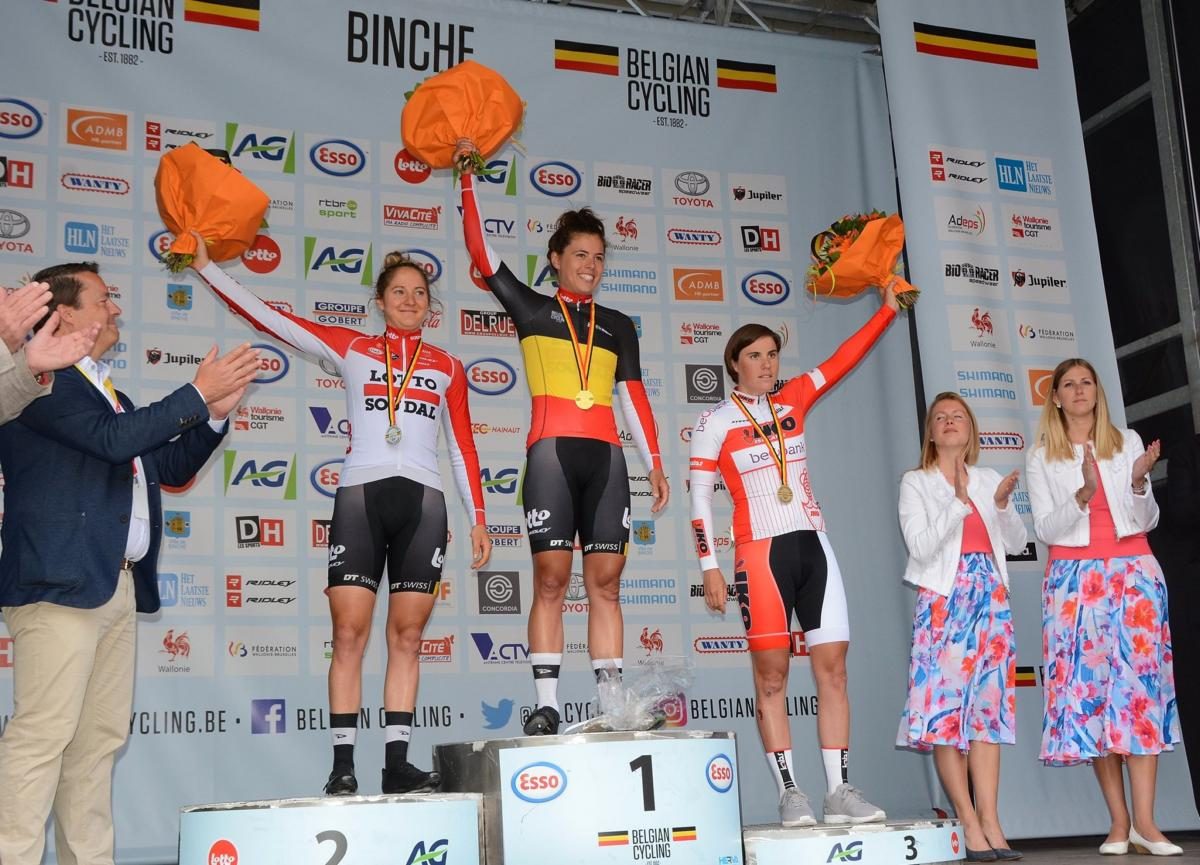Vandaag/dinsdag is het precies een jaar geleden dat Annelies Dom (33) zich tot Belgisch kampioene kroonde. De Antwerpse klopte aan het eind van de wegrit in Binche toenmalig ploeggenote Valerie Demey en Sanne Cant in een sprint met 4. Sofie De Vuyst vervolledigde het kwartet.