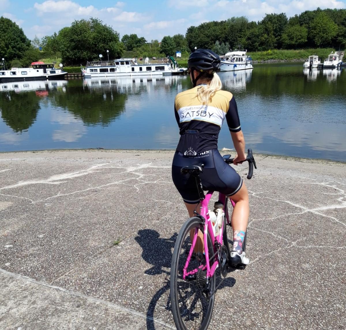 Wat we niet voorzien hadden, is dat er aan de linkerkant alleen maar gravel ligt. Met onze gewone racefietsen en smalle racebandjes dus een avontuur om recht te blijven. Met deze warme temperatuur, de zon en het water naast ons, waanden we ons al snel op vakantie. Niets moet dan en alles kan. Mijn man heeft blijkbaar nog meer conditie dan gedacht. Het was zijn 1e rit na zijn val 3 weken geleden. We raasden door het stof maar genoten met volle teugen.