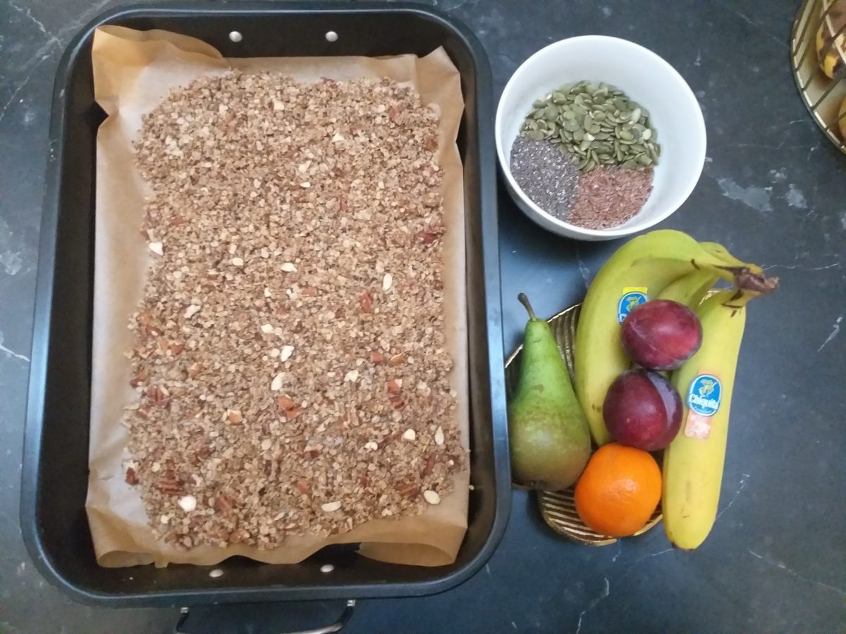 Onlangs zag ik een goeie tip voor een supersnelle granola waar geen oven aan te pas komt. Je maakt die namelijk gewoon klaar in de pan, op je fornuis. Je bent supersnel klaar, en je moet erbij blijven om de ingrediënten om te roeren. Het is me dan ook eens gelukt om het niet te laten aanbranden. Wat ik ook enorm positief vond, was dat ik er exact 15 minuten over deed om deze lading verse granola klaar te maken. Hij smaakt heerlijk en is, dankzij alle ingrediënten, heel voedzaam. Hierbij deel ik je dan ook graag mijn eigen, aangepaste versie van het receptje die ik voorbij zag komen.