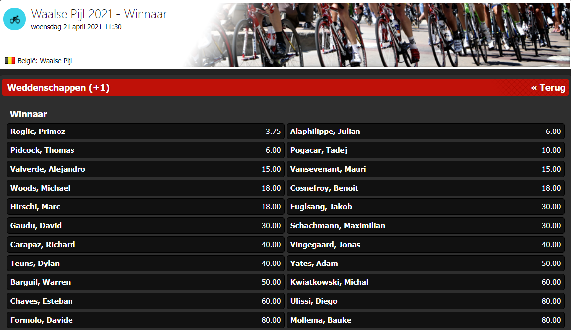 Woensdag is er de 85e editie van de Waalse Pijl, met vertrek in Charleroi en finish uiteraard op de top van de Muur van Hoei. Bij de ploeg van Mario Aerts, Lotto Soudal, zijn Tim Wellens en Philippe Gilbert de topnamen. Alaphilippe voert de troepen van Patrick Lefevere aan, maar die hebben natuurlijk ook nog de onweerstaanbare Mauri Vansevenant als outsider. En verder zijn natuurlijk Pidcock, Roglic, Valverde en Pogacar toppers om duimen en vingers af te likken.