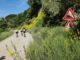 Ondertussen krijgen we meer en meer vertrouwen in de fiets. Bij een overzichtelijke helling laten we ons even gaan. De snelheid loopt op. We leggen ons plat over het stuur, poep een beetje naar achteren, diep in de beugels en 2 vingers op de remhendel. Lekker! Plots een bord ‘Strade bianche 13,95 km’ – achteraf merken we daar 53 km/u te hebben gereden. In de schaduw van de bomen zien we te laat het gravel opduiken. Met een rotvaart gaan we over de steentjes en knijpen we vertwijfeld in de remmen. De fiets schuift van links naar rechts maar met meer geluk dan kunde blijven we toch recht. Wat verder gaat de weg weer omhoog en gaat de snelheid eruit.