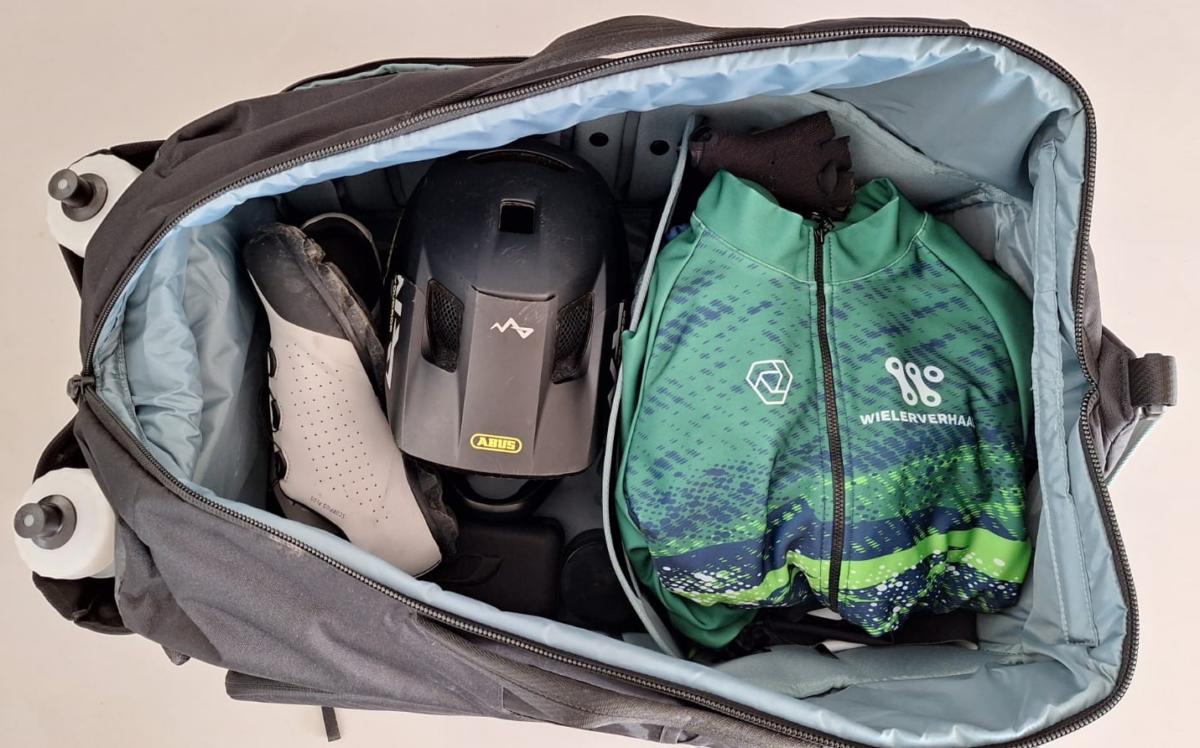 We starten uiteraard bij onze kledij. Wanneer je gedurende 8 dagen elke dag tussen 140 en 190 km dient af te haspelen, kan je er maar beter voor zorgen dat je 8 setjes meehebt. Een shirt kan je misschien nog uitspoelen maar een bezwete broek vervang je best dagelijks. Gelukkig is onze Thule Duffel compact en ruim tegelijk, terwijl de vele vakjes het inpakken makkelijk maken. We duiken in de kleerkast en diepen onze beste spullen op. We rollen de setjes mooi op en steken die in de  vakjes van onze Duffel. Ook 8 onderhemdjes vinden een plaatsje. Een wat dikkere vest met lange mouwen kan er ook nog bij.