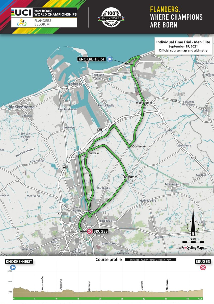 Na de zeedijk volgt een doortocht door het centrum van Knokke-Heist met een passage over de Dumortier- en Lippenslaan. Om het centrum van Knokke-Heist te verlaten werd gekozen voor een passage langs het Abraham Hansplein en het station van Knokke om via de Natiënlaan richting Westkapelle te rijden. In Westkapelle komen we in de open vlaktes terecht waar de wind vrij spel zal hebben op de Oostkerkestraat-N374. Aan de Oostkerkebrug slaan de U23 mannen, mannen en vrouwen elite rechtsaf om de Leopoldsvaart te volgen richting het noorden. De kanalen en vaarten met de typische bomen die getekend door de wind schuin gegroeid zijn, zullen vaak het decor vormen van de tijdritparcours.