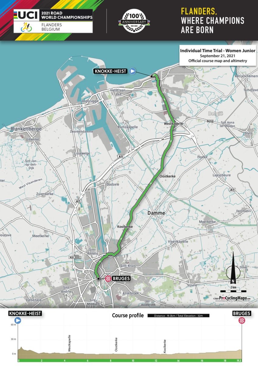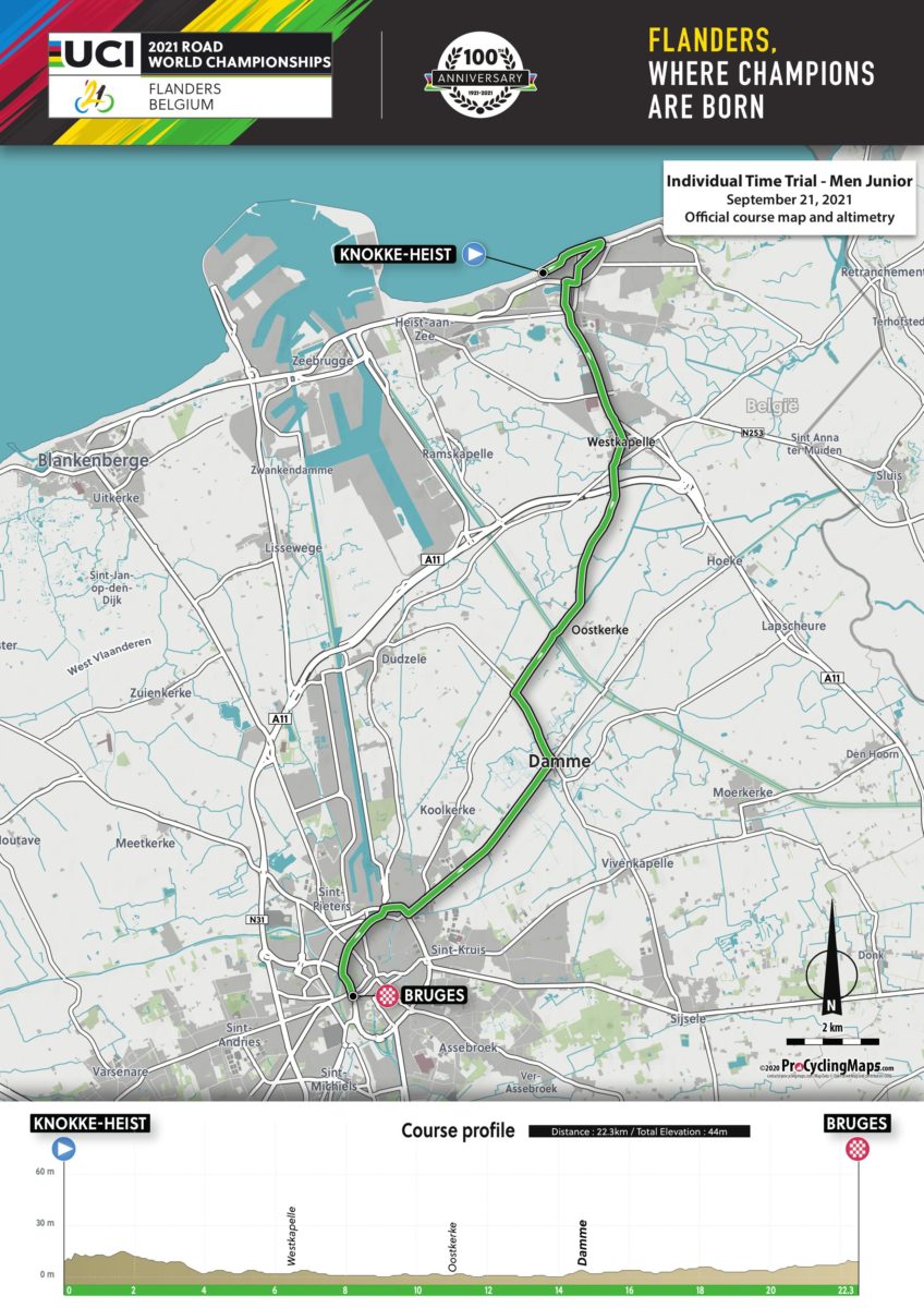 De start van alle tijdritten tijdens het WK 2021 in Vlaanderen ligt in Knokke-Heist. De startramp wordt gebouwd op het Noordzeestrand, ter hoogte van het casino, waarna alle renners, op de vrouwen junioren na, 1,5 km de zeedijk zullen volgen in oostelijke richting. De maximum afstand van de vrouwen junioren tijdrit is reglementair vastgelegd door de UCI. Om er voor te zorgen dat alle categorieën dezelfde accommodaties kunnen gebruiken, werd hier een uitzondering op gevraagd en toegestaan. Om de reglementaire maximum afstand echter zo kort mogelijk te benaderen zullen zij de kortste weg richting Brugge volgen.
