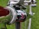 Onze fiets is dus van boven tot onder afgewerkt met de groep die de Japanners ontworpen om Campagnolo van de troon te stoten. Derailleurs, trapstel en trapas, balhoofd, wielnaven, pedalen, remmen, zelfs de remblokken zijn Dura Ace. Mavic-velgen voor tubes met daarop 22 mm brede Continental Giro’s ronden het geheel af. Gewicht: een verbazende 9,3 kg, pedalen en bidonhouder inbegrepen. Vooraan zorgt een 52-42 tandwielcombinatie ervoor dat het goed vooruit gaat. Achteraan brengt een 6-speed 12-20 cassette de kracht naar het asfalt. De Poggio in Diest zal voor een andere keer zijn, vrezen we. De voorvork is prachtig gechromeerd en ook de achtertrein en de lugs vooraan zijn met het glimmende goedje afgewerkt. Gewoon prachtig! Maar in plaats van het overbekende rode kleurtje is ons vehikel in prachtig bordeaux gespoten. Waarmee onze fiets toch weer wat exclusiever wordt, niet?