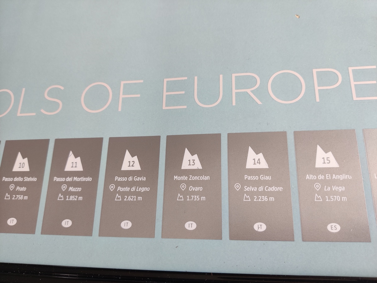 Of wat dacht je van volgend lijstje. Mont Ventoux, Alpe d’Huez, Col du Galibier, Col de la Madeleine, Col de l’Izoard, Col de l’Iseran, Col de la Croix-de-Fer, Col d’Aubisque en Col du Tourmalet verdedigen de Franse eer. Passo dello Stelvio, Passo del Mortirolo, Passo di Gavia , Monte Zoncolan en Passo Giau laten je van Italië dromen. Terwijl de Alto de El Angliru, Lagos de Covadonga, Pico del Veleta en Bola del Mundo ons naar Spanje brengen, krijgen ook de Grossglockner (Oostenrijk) en de Furkapas (Zwitserland) hun plaatsje op de kaart.