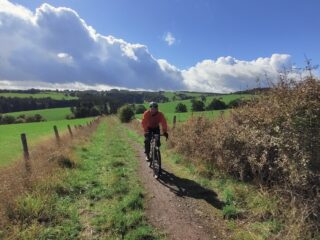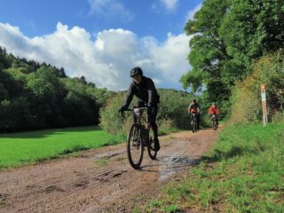 Kort na de start gaat het al omhoog. Terwijl aanvankelijk de hellingsgraad nog bescheiden proporties aanhoudt, kruipt die langzaamaan omhoog. Aan het zware gehijg en de schuddebollende hoofden te merken, zijn we niet de enige wiens hartslag nu al in het rood gaat. We zijn vertrokken voor een 100-tal km en 2.200 hoogtemeters door de prachtige, maar natte Eifel. Routebouwer Gijs Bruinsma heeft zijn huiswerk goed gemaakt. Het traject bevat zowat alles wat je iemand voor de wielen kunt schuiven: asfalt, goed gravel, slecht gravel, veldwegen, singletracks, een beestenpad, een rivierkruising en een modderhelling om U tegen te zeggen. Dat laatste betekent wel dat we te voet omhoog moeten glibberen.
