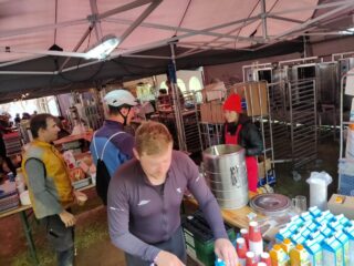 Na goed 30 km volgt de 1e bevoorrading. Niks te laat. Die ligt aan het einde van een lange klim en de weergoden hebben net besloten dat het tijd werd om het begrip ‘stortregen’ kracht bij te zetten. Bovendien hebben we het parcours en de omstandigheden te licht ingeschat. Bij de start hoopten we dat het stevige ontbijt wel voldoende zou zijn voor de eerste uurtjes. Maar het zware parcours maakt dat we meer tijd en gelletjes nodig hebben. Het gebak smaakt overheerlijk!