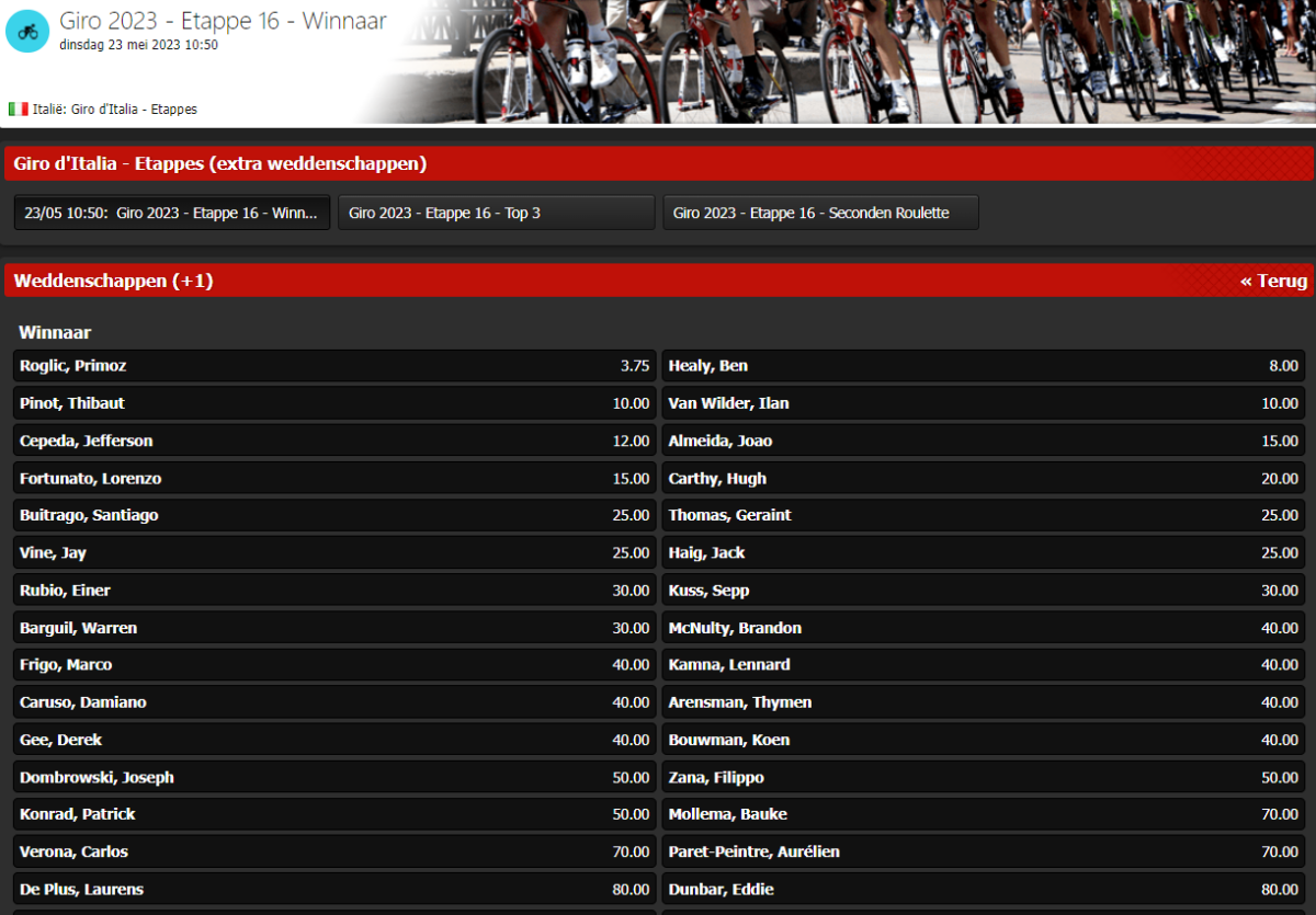 Een andere naam die spontaan te binnen schiet voor dit soort etappes is die van Thibaut Pinot. De Fransman is bezig aan zijn laatste profseizoen en wil duidelijk de show stelen. Een prachtige solo op de Bondone zou in dat verhaal zeker op zijn plaats zijn. En als het een spel tussen de favorieten wordt? Dan is Eddie Dunbar misschien wel een gokje waard. De Ier rijdt een opmerkelijke Giro voor eigen rekening en lijkt met de dag beter te worden. Misschien dat ze ergens onderweg nog wel een achtergebleven renner uit 1956 tegenkomen.