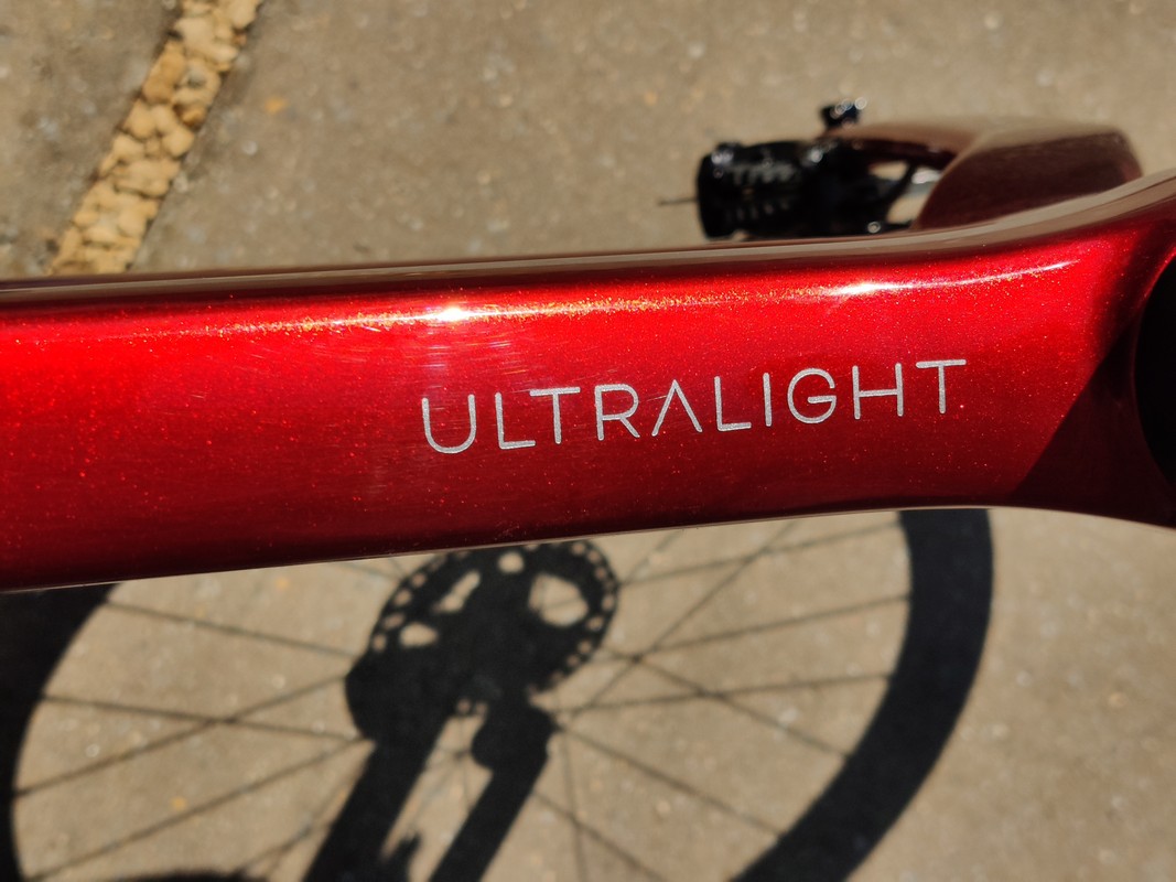 Tijd dus om op stap te gaan. De rijpositie is erg goed. Hoewel de cockpit volledig geïntegreerd is, voelt de fiets van bij het begin aangenaam aan. Bij het bestellen kan je natuurlijk altijd de stuurpenlengte en de stuurbreedte naar je eigen fit aanpassen. Het Prologo Dimension-zadel past prima, maar zoals we weten is dat behoorlijk persoonlijk. Al snel valt de reactiviteit op. Bij het accelereren na een bochtje pakt de Ultralight erg snel weer snelheid op. Het stuur ligt goed in de hand, al hadden we graag een wat meer doorgetrokken stuurlint gezien voor de langere tochten.