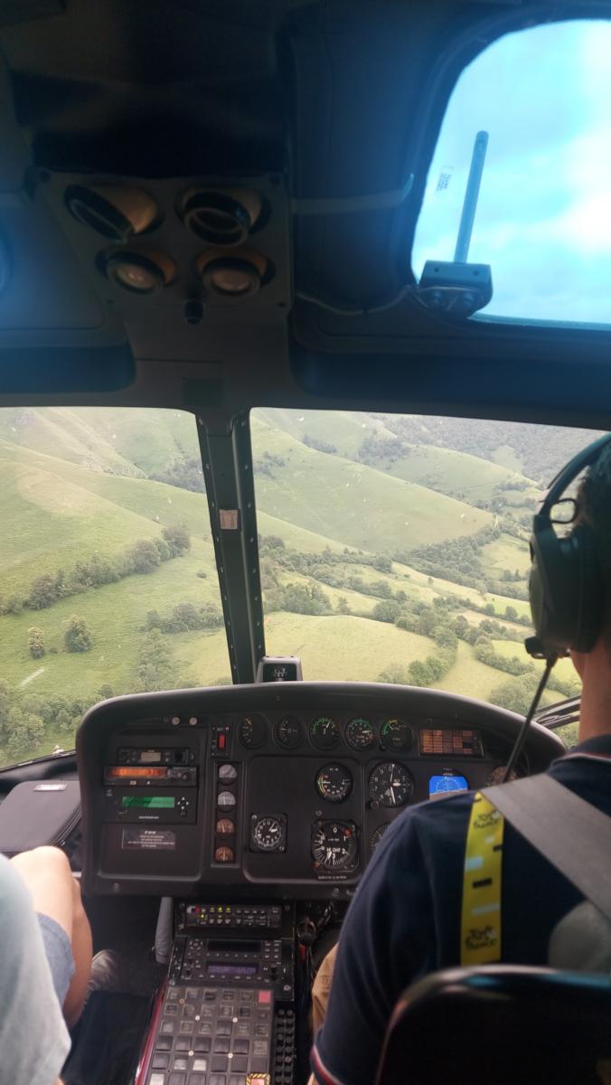 Horillo showt in de downhill zijn raceskills. Dat maakt dat we snel aan de Col d’ Ichère en vervolgens aan de Col de Marie Blanque komen. Aan de voet van die Marie Blanque stappen we uit om de kopgroep met Van Aert, Alaphilippe en Neilands te zien passeren, waarna we met de helikopter van ASO van de grond mogen. Machtige views zien we van het peloton, renners onherkenbaar maar deze ervaring is uniek. Geheel anders nog dan vorig jaar over Denemarken. Na onze landing zijn we in no time aan de finish waar we de laatste 5 km van Jai Hindley richting de dagzege zien. Maillot jaune erbovenop is zijn topbeloning.