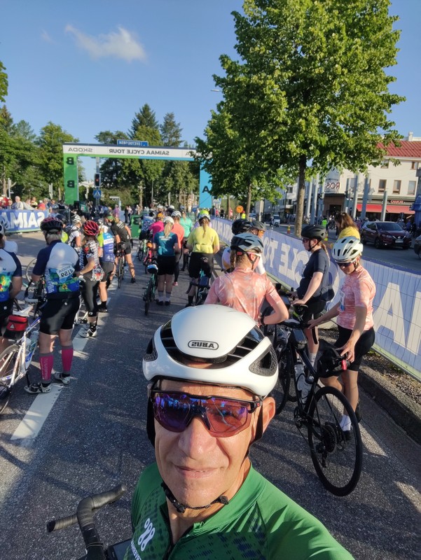 Als 1e vertrekken de vrouwen. Om de 4 minuten volgt een volgende golf. We vertrekken over de brug die over de watervallen ligt, maar keren aan een rotonde een eindje verder terug aan de andere kant van de weg. Zo passeert elke groep voorbij het talrijk opgekomen publiek en de andere wachtende renners. Er wordt geapplaudisseerd, gewuifd en geroepen. Een fijn moment. Al snel verlaten we de stad en nemen we de weg richting Lappeenranta. We krijgen meteen een mooie indruk van wat ons te wachten staat: prachtige natuur, enthousiaste bewoners die overal staan te applaudisseren, en vooral: lekker fietsen. Wanneer we een brug oversteken staat er aan de zijkant een heus koor te zingen. Geweldig!