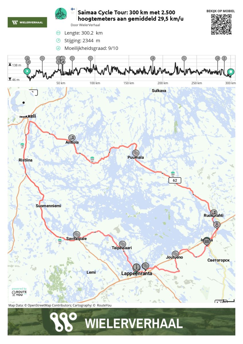 Het 300 km lange traject van de Saimaa Cycle Tour strekt zich uit ten noordwesten van Imatra en brengt ons naar steden als Lappeenranta, Mikkeli en Puumala. Maar meer nog, door de prachtige natuur. De wegen zijn goed, tot af en toe matig. Lappendekens moet je niet verwachten, maar hier en daar komt grof kapotgereden asfalt de goede indruk wat bederven. Wie verwacht dat de weg vooral vlak is, komt bedrogen uit. Onze fietscomputer gaf na de rit 2.500 hoogtemeters aan. Die worden letterlijk verspreid over 300 km.