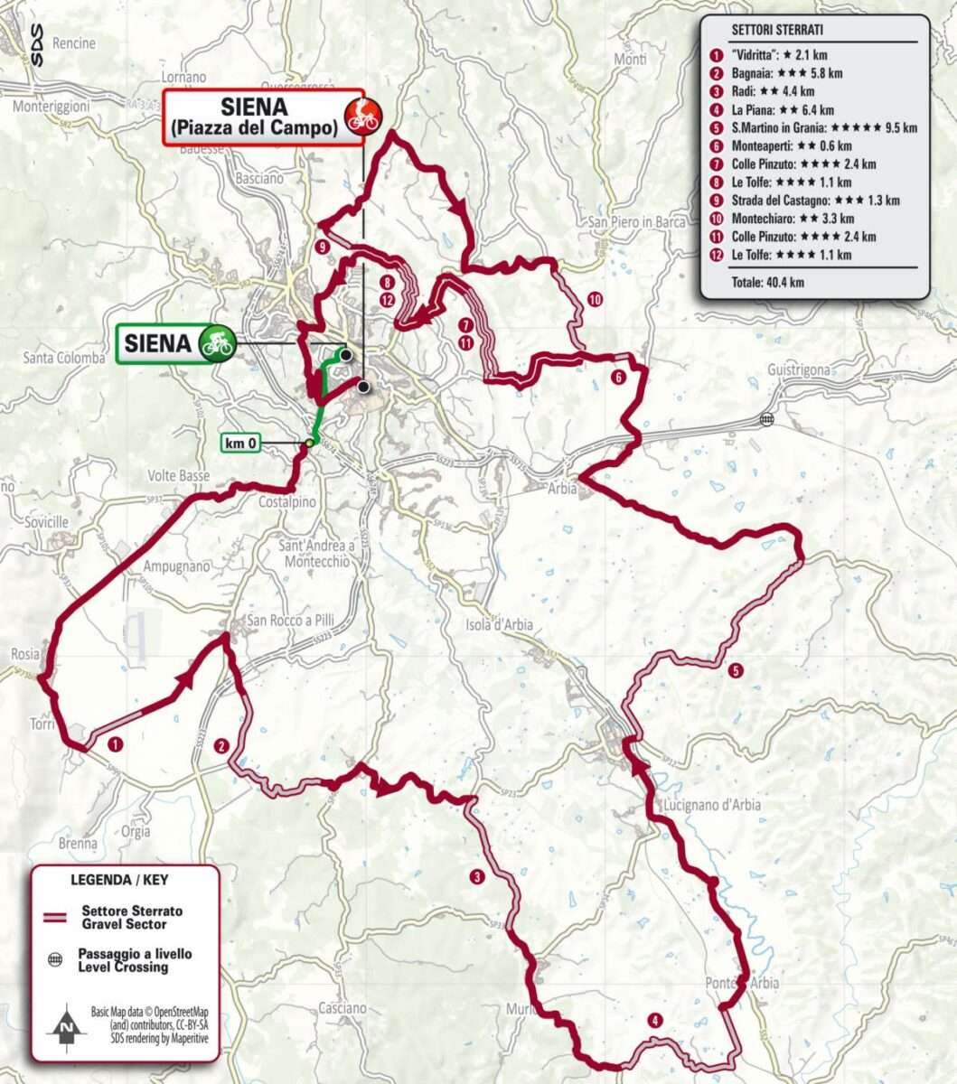 Voor het eerst rijden de mannen meer dan 200 km. De vernieuwde route leidt hen over 215 km met 15 gravelstroken, goed voor in totaal 71 km onverharde ondergrond. De route vertrekt via een lus van 160 km met enkele steile klimmen en verraderlijke bochten. Ook de klassieke stroken zoals La Piana en de zware klim vanuit Ponte del Garbo worden in het 1d deel van de wedstrijd aangedaan. Vervolgens komen de renners op een 30 km lang circuit waarbij ze een aantal stroken 2 keer zullen afleggen.