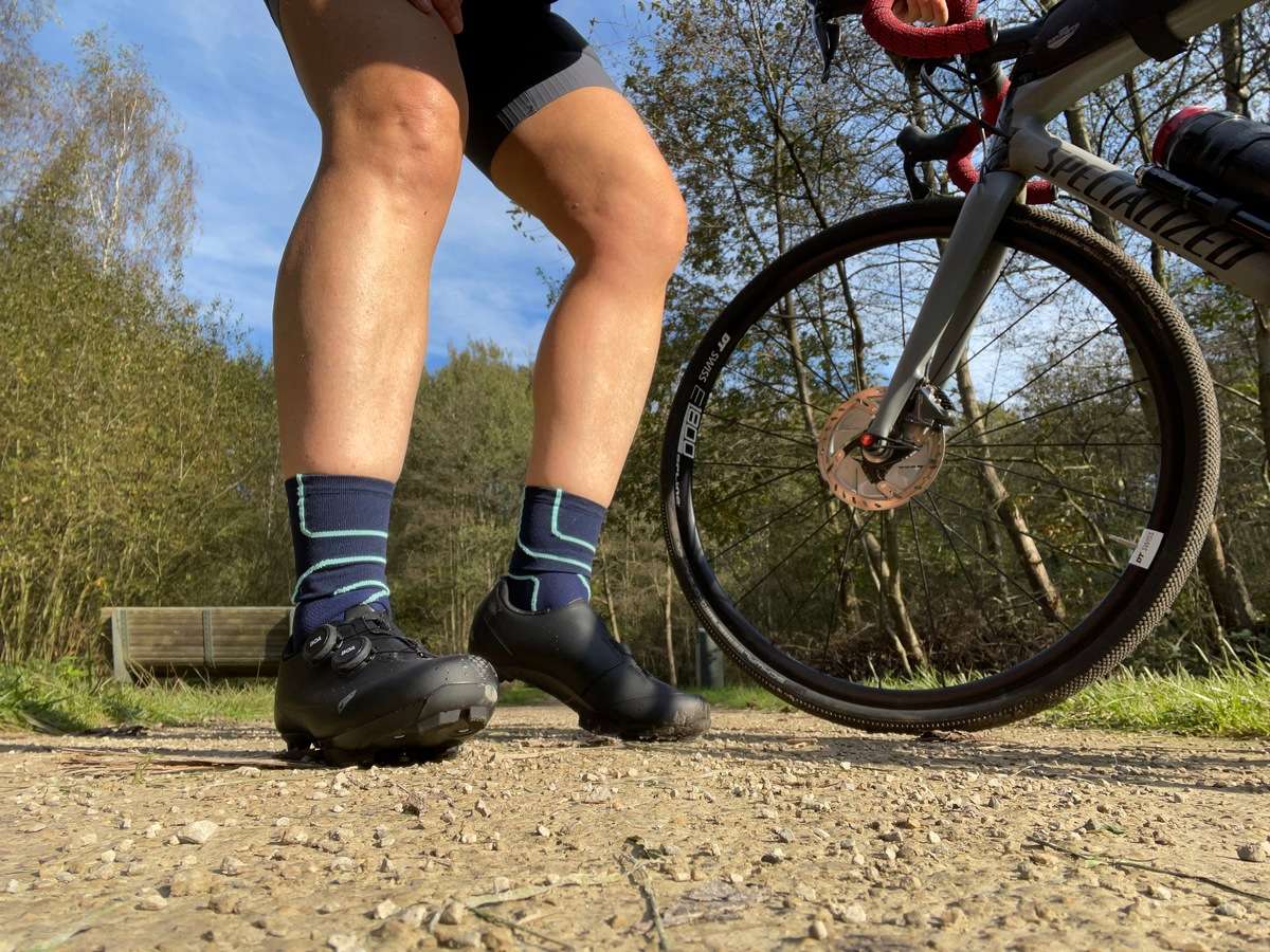 Die klikken met gemak vast in de SPD-pedalen, zo blijkt snel. Klaar voor een, hopelijk, leuke graveltocht. De dag is nog jong, de zon komt al piepen. Voor ons liggen brede karrewegen, sommige met losse stenen of bedekt met herfstbladeren, anderen met mooie grindstroken. En af en toe een bospad met modder en boomstronken. De perfecte test voor de schoenen die ons door erg gevarieerd terrein zullen moeten begeleiden.