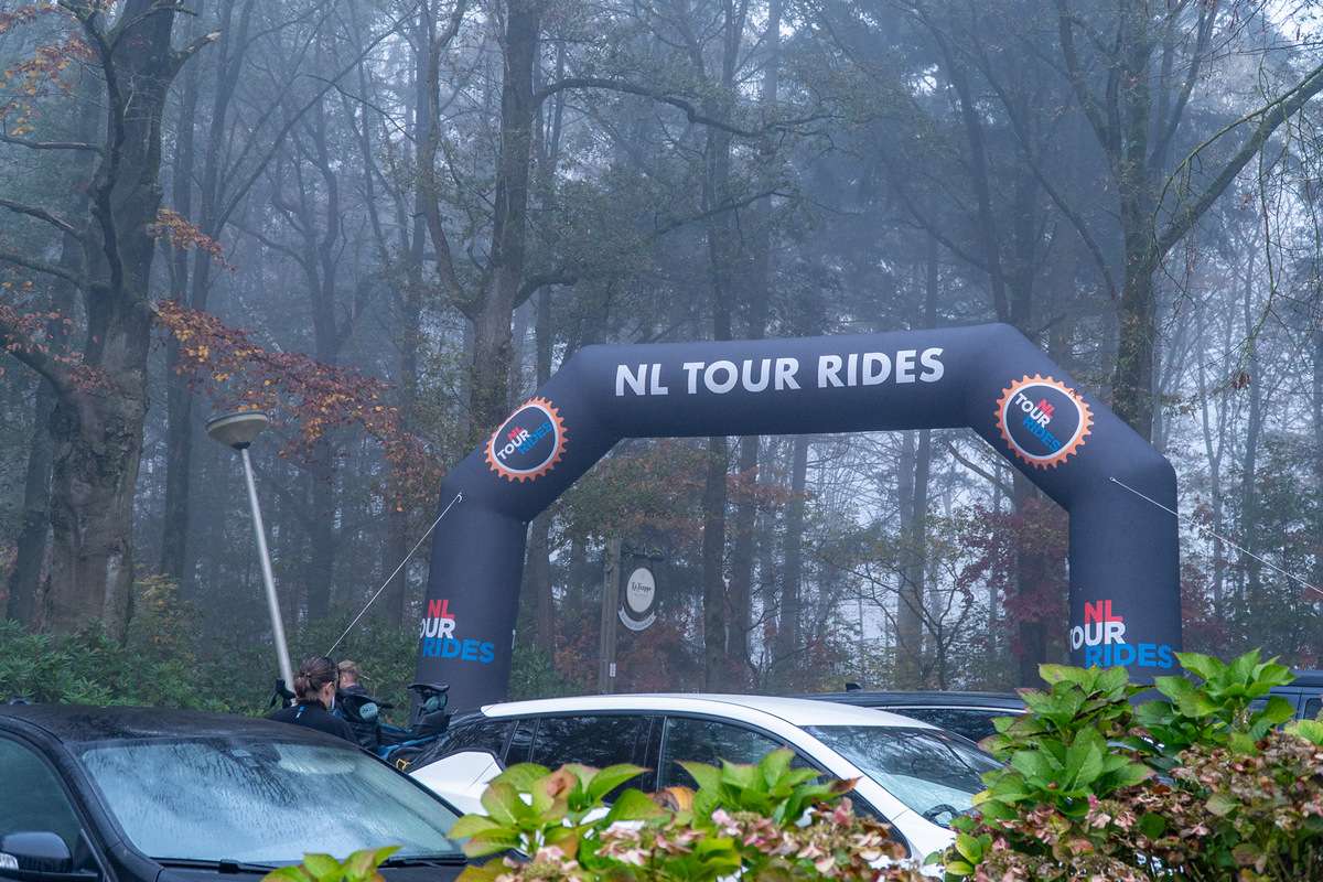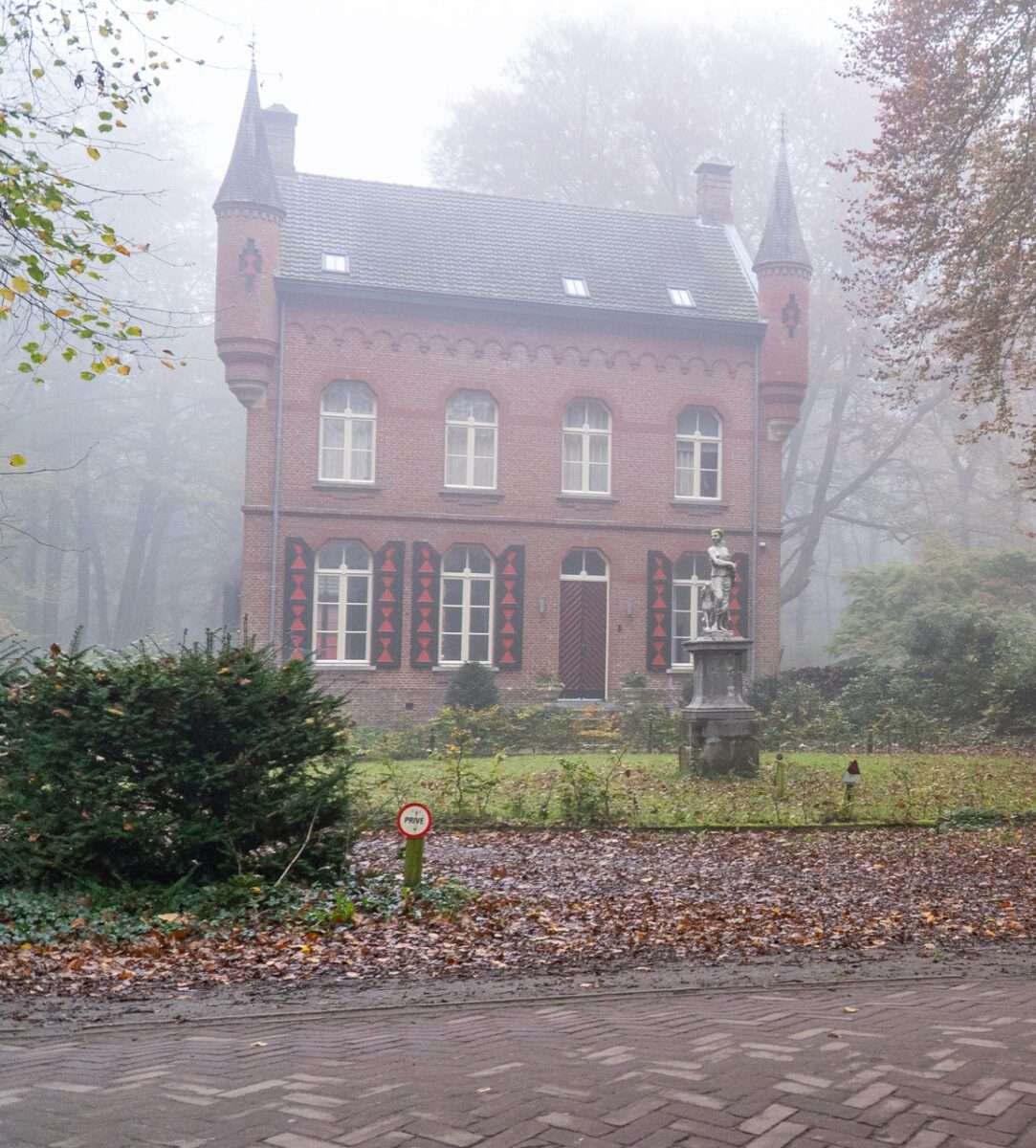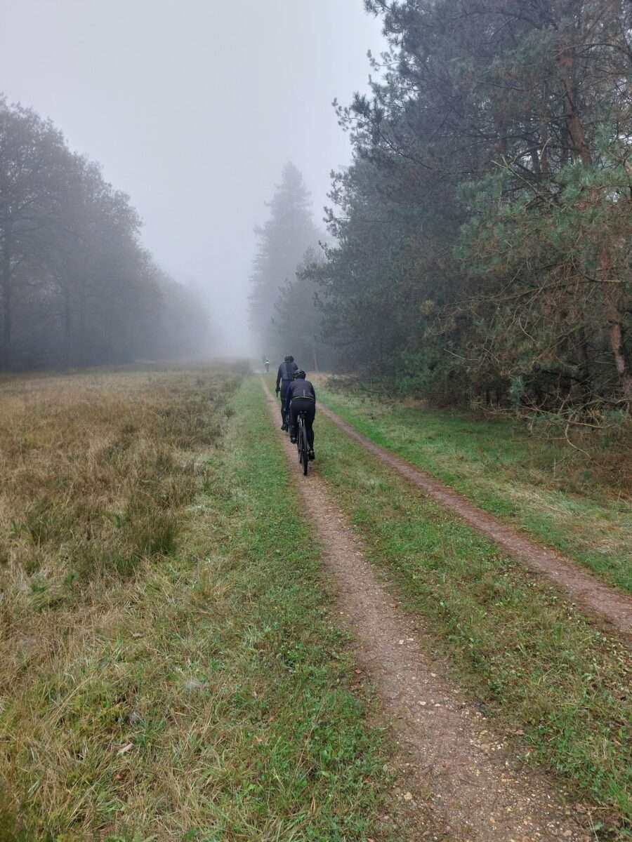 Na ons deelnamepakket – met onder meer een buff en Noord-Brabantse (lees: wit-rood geblokte) wielersokken – te hebben afgehaald én na een dampende mok koffie, trekken we ons in gang. We starten met een noordelijke lus van ongeveer 12 km. Tijdens deze lus rijden we doorheen het idyllische landgoed ‘Gorp & Roovert’, bestaande uit zowat 800 ha bos en 370 ha landbouwgrond. De blikvanger van dit landgoed is het Neogotisch jachthuis, dat in het mistige decor niet misstaat in deze Halloweenperiode.
