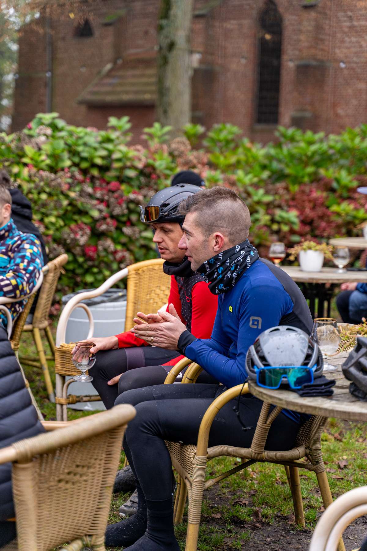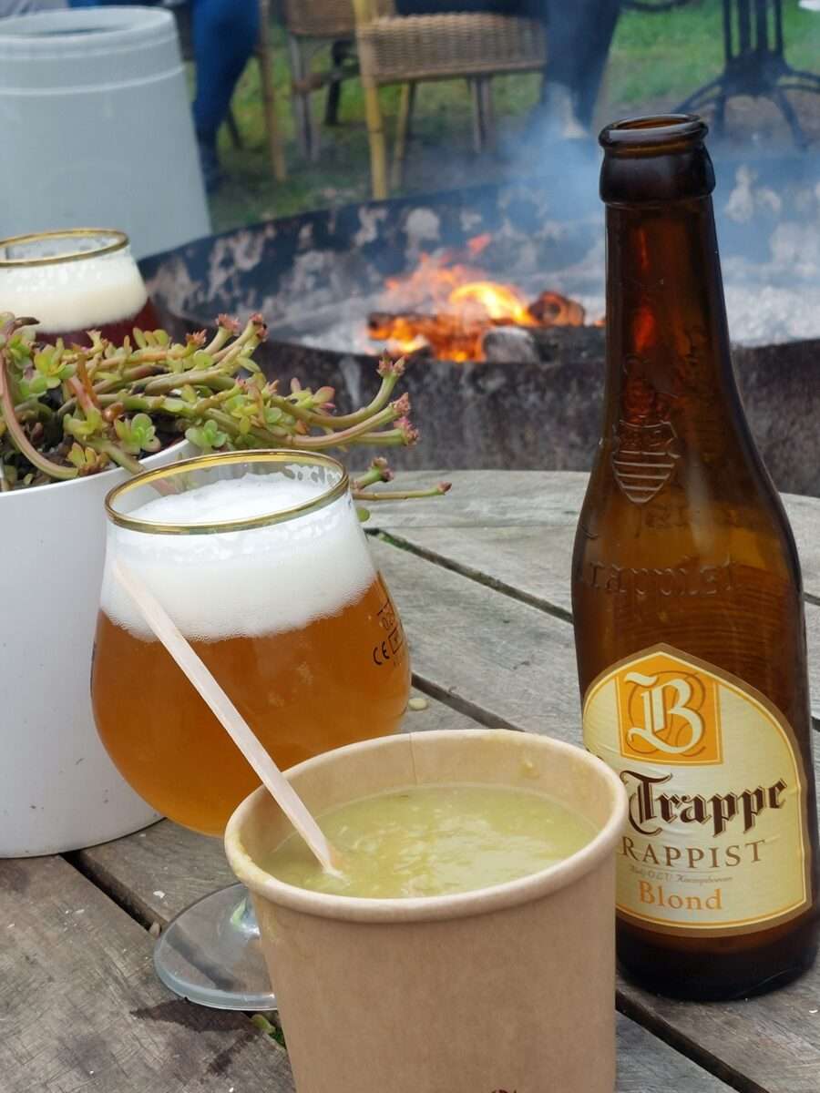 Aangekomen aan de finish laven we ons aan een overheerlijke portie snert – een copieuze erwtensoep –  en een La Trappe Trappist. Nadat de vuurkorf terug leven heeft geblazen in onze onderkoelde ledematen, keren we huiswaarts. De boordcomputer van de auto geeft een buitentemperatuur van 6° aan én, jawel, de mistlampen mogen ook weer aan. Hoewel het voorspelde herfstzonnetje verscholen bleef achter een mistgordijn, was het toch wederom een topdag op de fiets. En, geloof het of niet, hoe dichter bij huis hoe meer de zon opnieuw tevoorschijn komt.