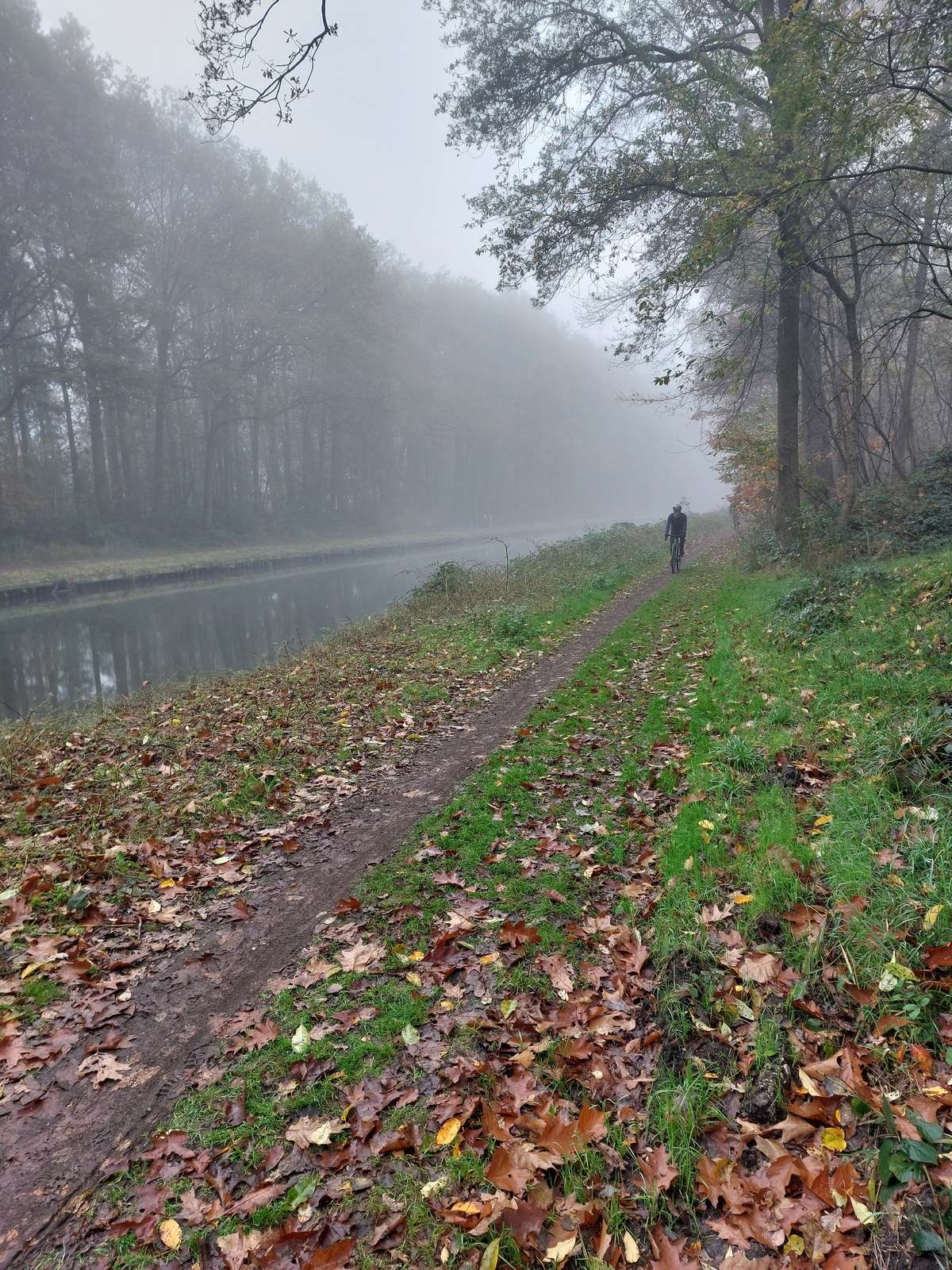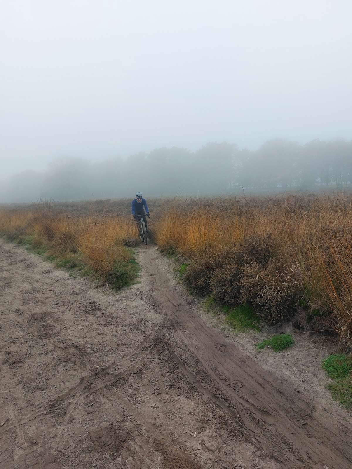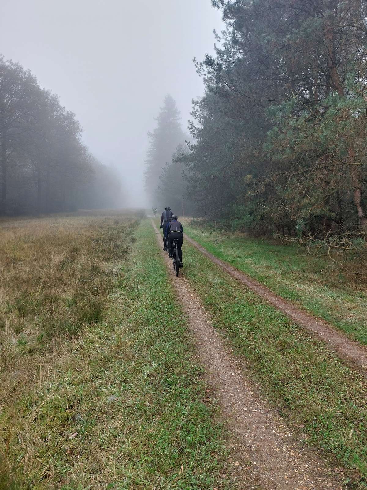 Na een 20-tal km rijden we de Noorderkempen binnen. Meteen wordt duidelijk waarom deze regio zo geliefd is onder gravelgrinders. Heerlijke rechttoe rechtaan gravelbaantjes, zonder al te veel gedraai en gekeer, waarop stevig doorgejast kan worden. Met een karrenvracht aan goed bollende karrewegen worden we uitermate verwend. Vooral de 7 km lange kaarsrechte strook doorheen het Gewestbos van Ravels is ‘kicken’ geblazen. Ook tijdens het stuk langs het Kanaal Dessel-Schoten kan gedurende 5 km stevig doorgeramd worden. Het samenspel tussen de mist en het water zorgt bovendien voor een mystiek schouwspel.