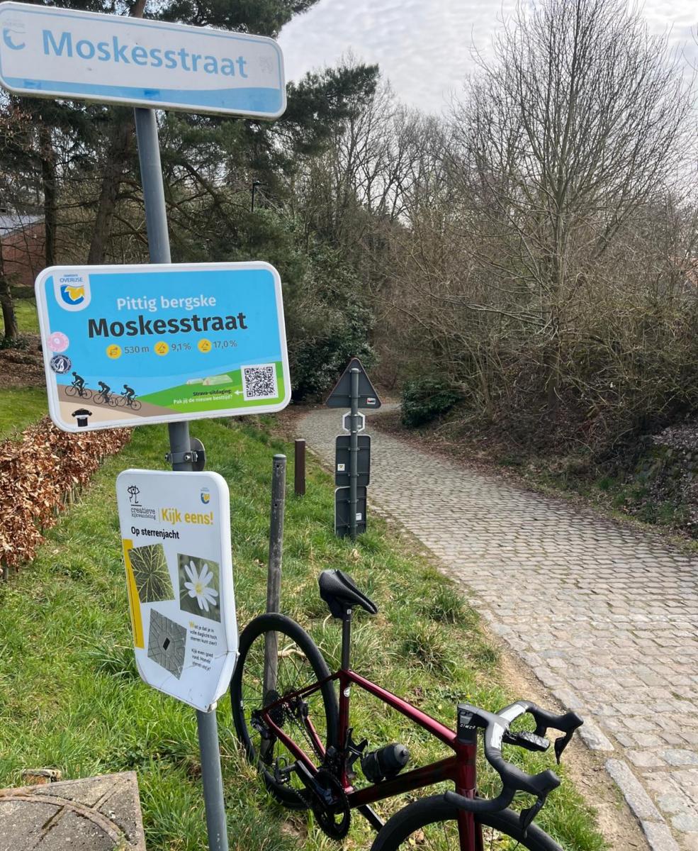 In de Druivenstreek liggen tientallen hellingen die, gecumuleerd in een tochtje van een 100-tal km, geweldig pijn kunnen doen. WielerVerhaal maakte in een 3-delige reeks een uitgebreide selectie van de pittigste klimmetjes. Aan de voet van vele van die hellingen vind je ook een helblauw bordje met de naam van de helling, de lengte en het gemiddelde en maximale stijgingspercentage. De nijdigste klim, de Moskesstraat, hebben we voor dit laatste deel gehouden.