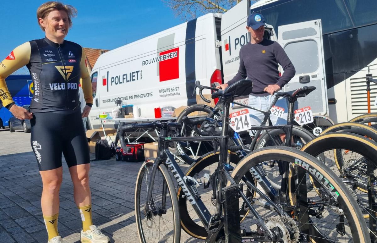 Wanneer de rensters stelselmatig binnendruppelen, wordt hen gevraagd welke bandendruk ze wensen en worden de banden naargelang opgepompt. De rensters brengen hun trainingsfiets mee en ook die worden nog snel klaargestoomd, waarna ze door Klaas op het dak van de volgwagen worden gemonteerd.