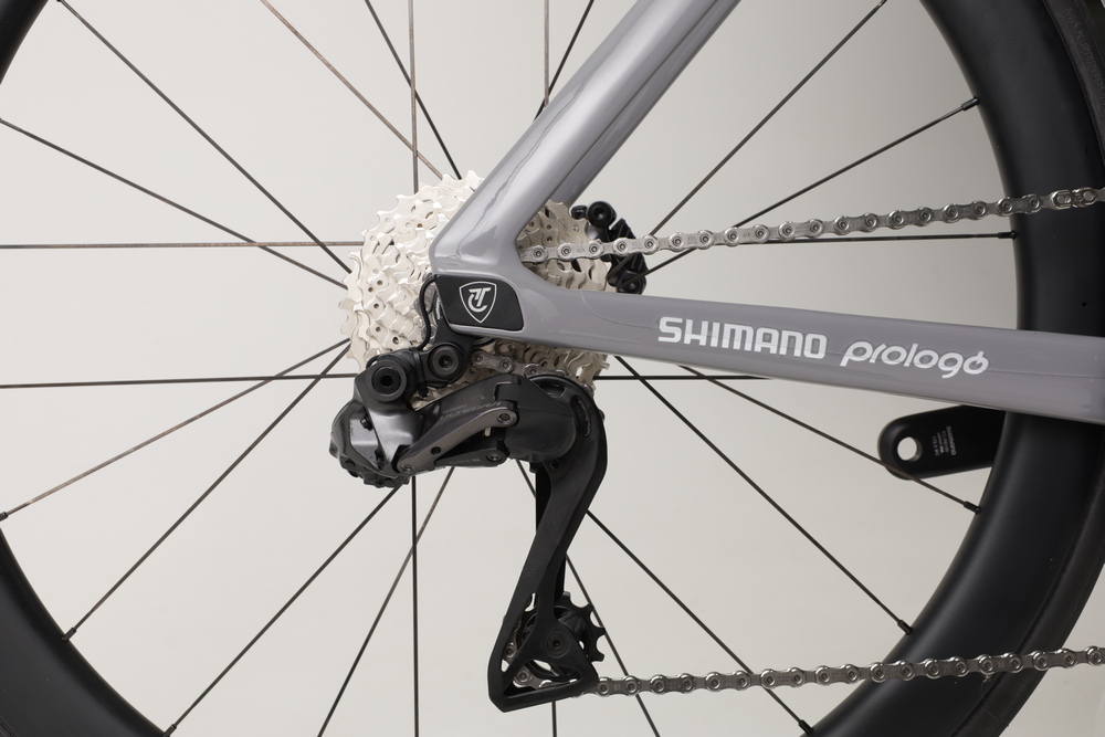 Een ander detail waar de Titici-ingenieurs aandacht aan besteedden, was de positie van de batterij van het elektronisch schakelsysteem in het frame. Ze creëerden hiervoor een gleuf in het onderste deel van de zitbuis, onder de steekas. Ten slotte is het gewicht van de fiets niet onbelangrijk, hoewel dit niet het 1e aandachtspunt is voor een fiets die de nadruk legt op een lage luchtweerstand. Voor een aerofiets zit het gewicht van de Alfa best goed: in hun beste set-up op hun website halen ze 7,3 kg.