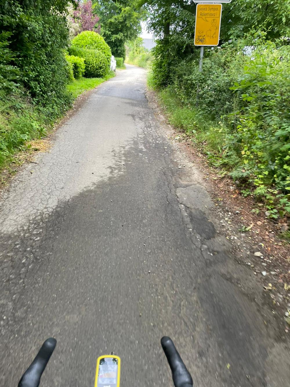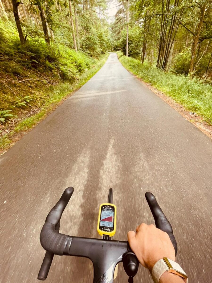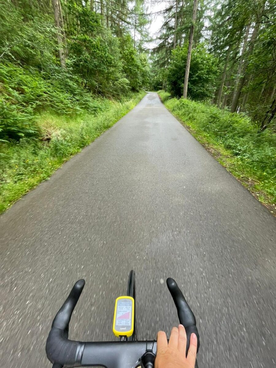 Sowieso kan je stellen dat deze 1e km het zwaarst is, vooral naar het einde van die km toe. De weg is smal en niet in perfecte staat, maar tussen de bomen heb je wel beschutting en is het eigenlijk gewoon jij tegen de natuur. Verkeer is hier nauwelijks, en door het bos heb je vaak niet door hoe steil het hier werkelijk is. Niet zozeer de maximale percentages, maar wel de lengte van de steile meters maakt er een zware beproeving van.