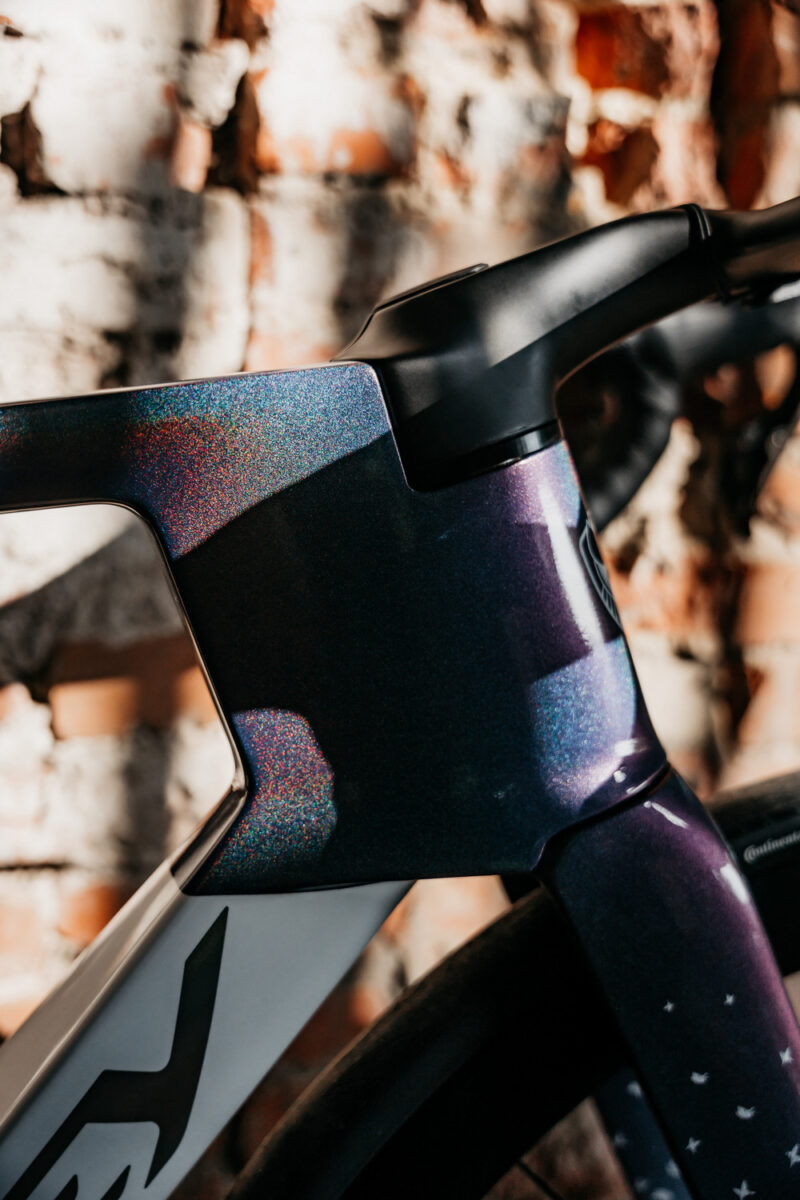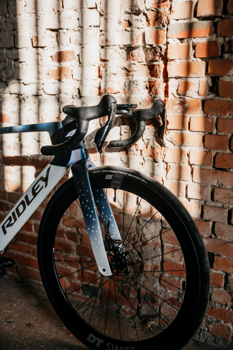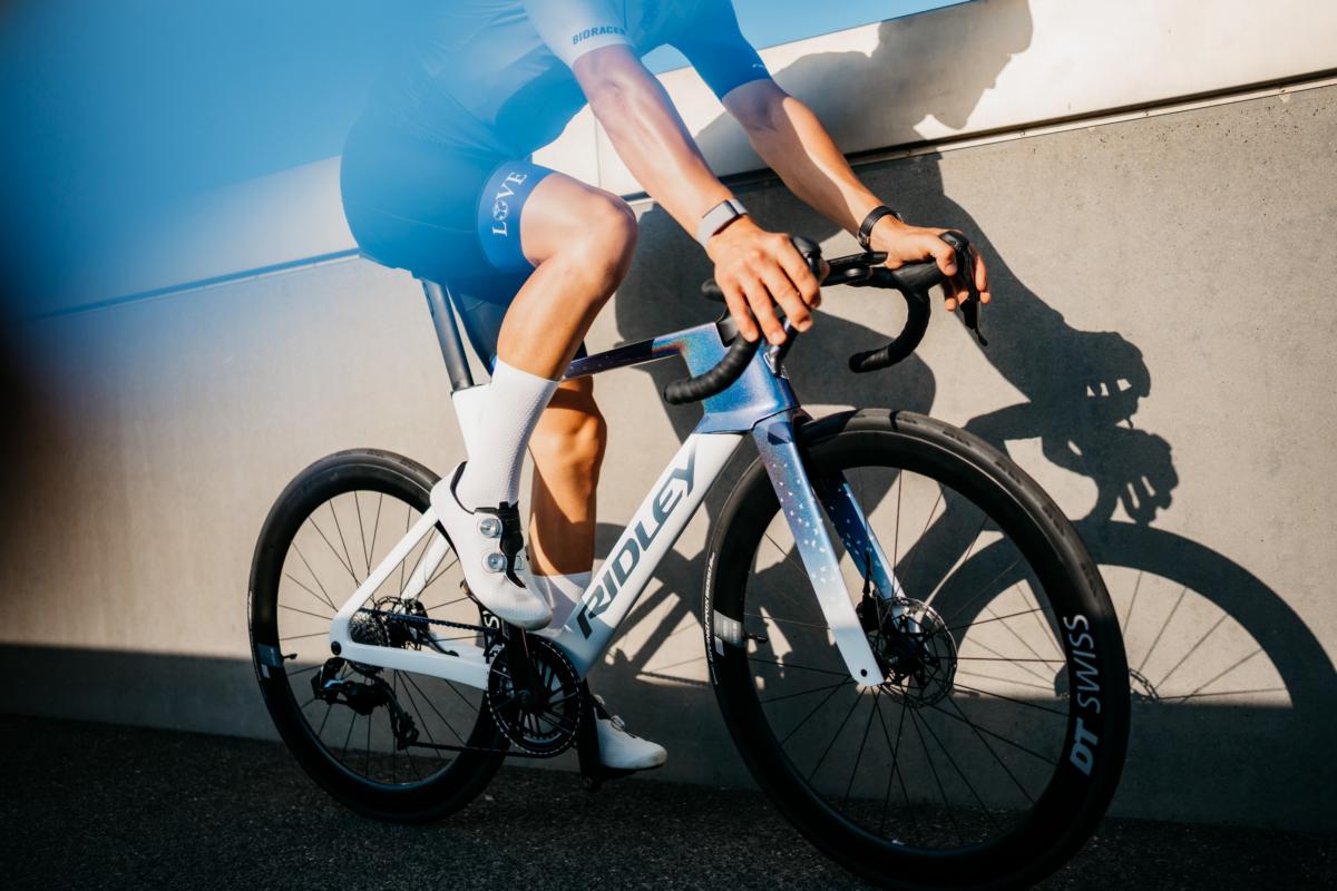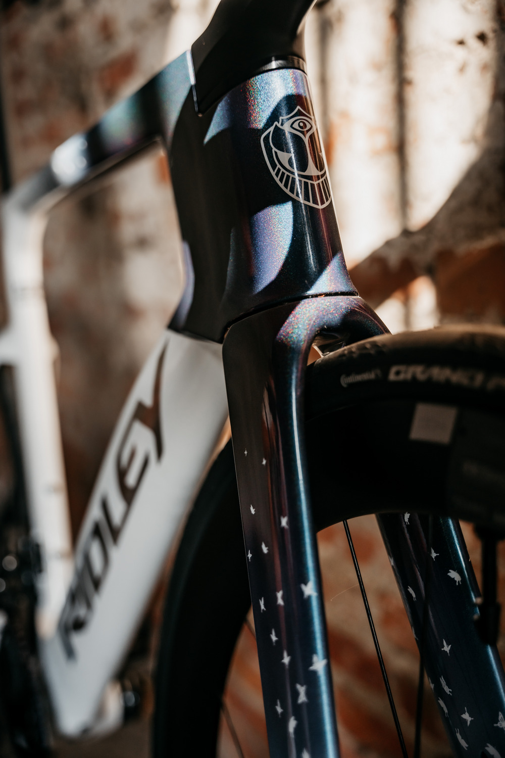 Daarbovenop zorgt een prismatische afwerking voor een regenboogachtige olievlek-glans. Subtiele Tomorrowland-elementen en zilverkleurige Ridley-logo’s maken het geheel af. De lak maakt van de fiets een visueel statement, maar onder de oppervlakte schuilt de bekende Ridley-prestatietechnologie: aerodynamisch geoptimaliseerd, raceklaar en lichtgewicht, wat je ook wel mag verwachten van de fietsen waarop de renners van Uno-X het hoogste niveau halen.