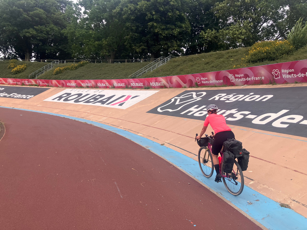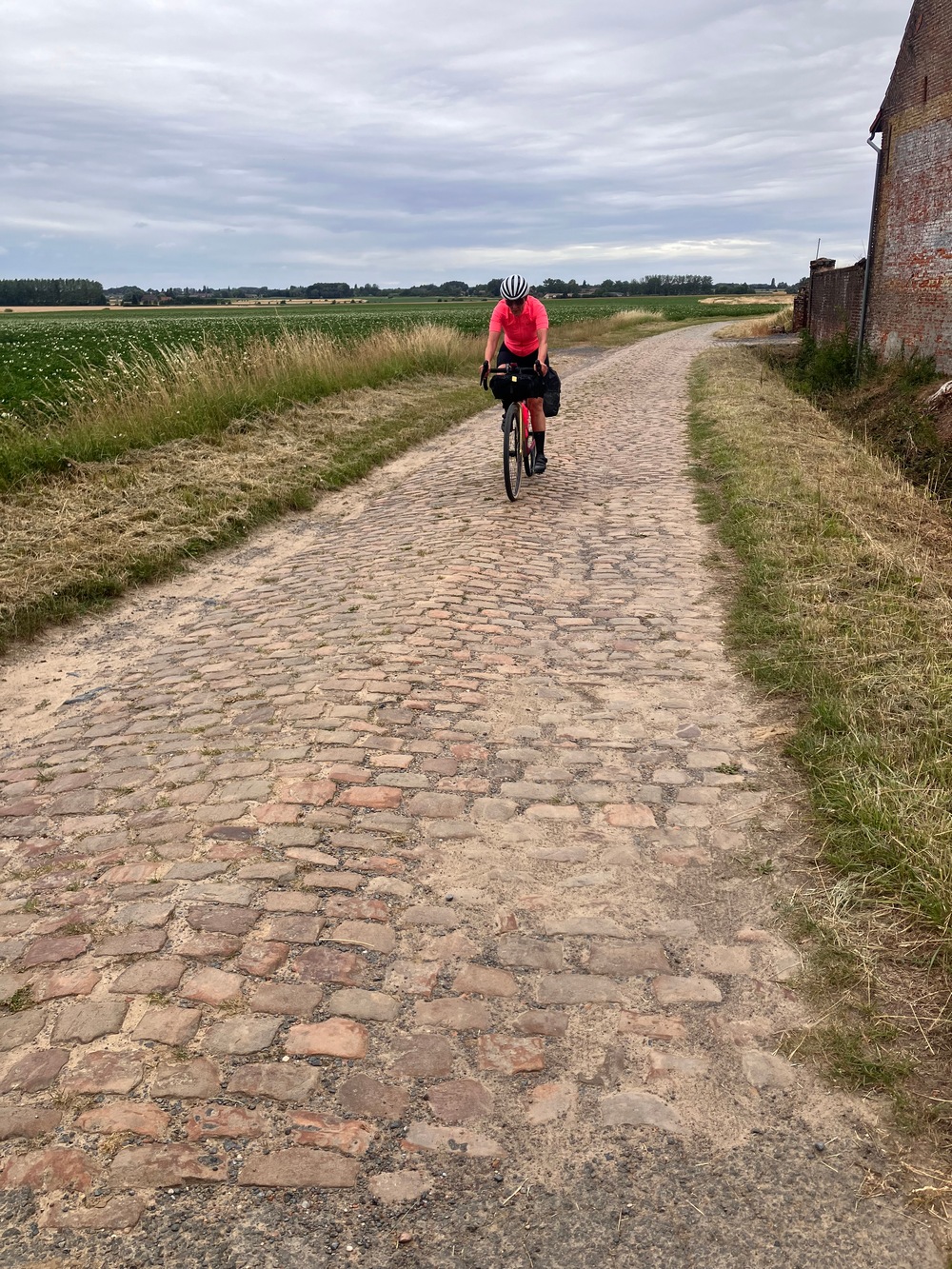 Tijdens een meerdaagse fietstocht mag je vooral niet vergeten te genieten, dus nemen ze af en toe hun tijd voor een terrasje. Bij de herstart doemt het volgende obstakel alweer op. “Ik kan niet meer inklikken, maar gelukkig krijgen we het schoenplaatje snel weer in orde. Net op tijd, want we bereiken Roubaix en de gevreesde kasseistroken liggen voor ons. Als een volleerde Parijs-Roubaix renner probeer ik de genadeloze stenen te trotseren. Alles danst in mijn achterzak.”