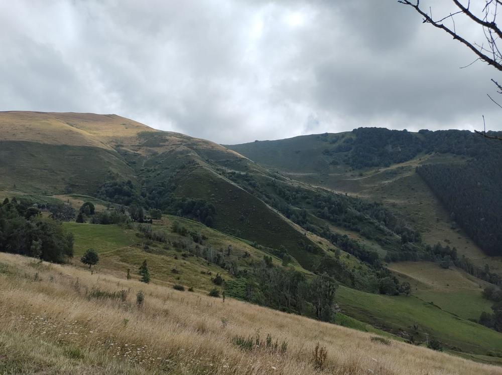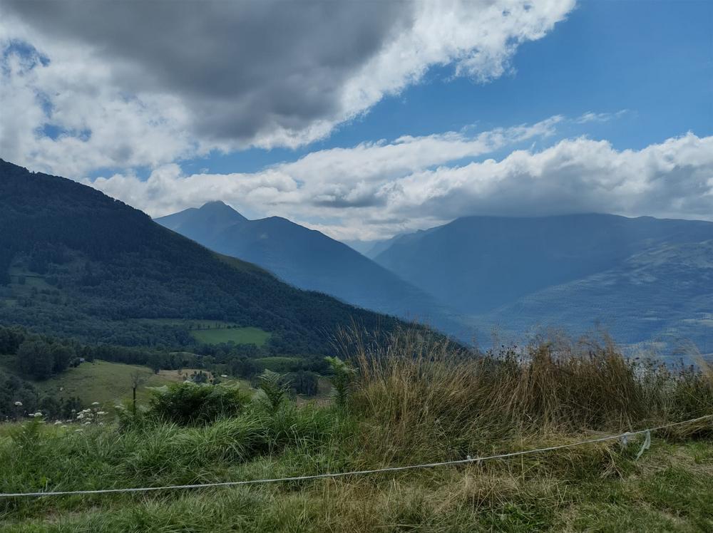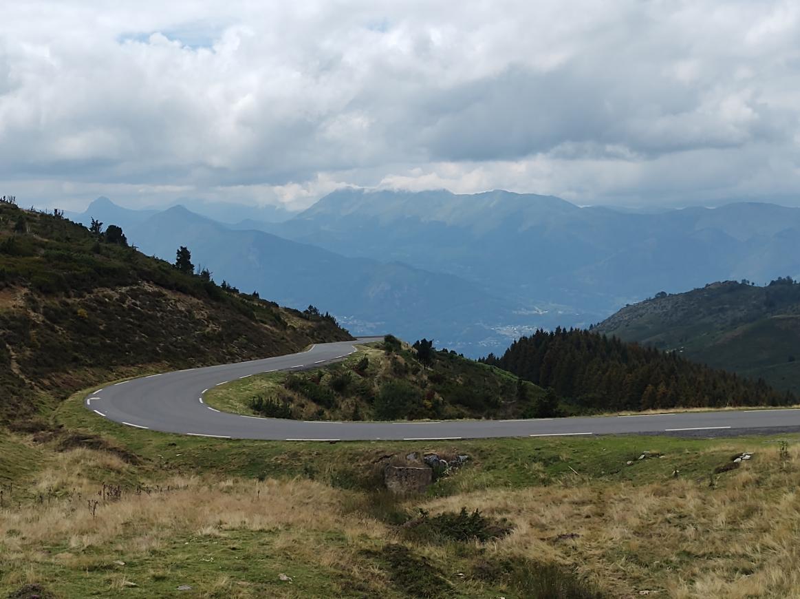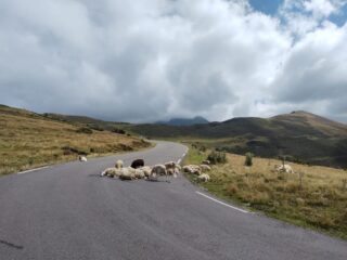 Wie meteen een 2e Pyreneeëncol wil afvinken, kan nog een km verder klimmen tot de top van de Col de Tramassel. We schatten dat de weg gemiddeld 8% oploopt, zeker haalbaar als je al tot hier bent geraakt. Wij waren er in elk geval beter aan toe dan de schapen die midden op het asfalt lagen. De weg kronkelt in het slotakkoord net iets meer langs de bergwand, wat mooi contrasteert met de bergen op de achtergrond.