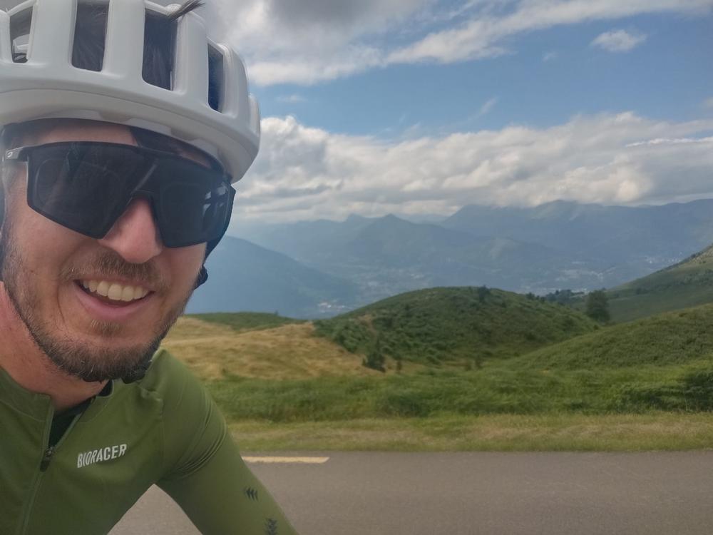 In de 2e helft van de klim schieten sommige pentes een eind in de dubbele cijfers, een aantal keer geeft onze GPS zelfs 15% aan. We beginnen stilaan te begrijpen hoe Pogačar hier Vingegaard 2 minuten aan de broek smeerde. De moeilijkheid zit hem vooral in het mentale, want de col haalt soms een goocheltruc uit. Op een stuk dat helemaal niet steil lijkt, hebben we plots geen kroontjes meer over. Gelukkig leidt het uitzicht af: bij de voet niet zo speciaal, maar hoe hoger je klimt, hoe mooier het zicht op de omliggende bergen wordt.