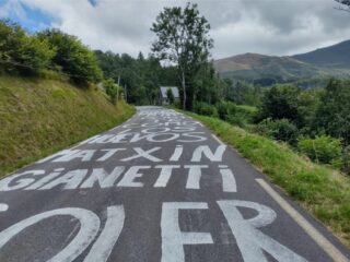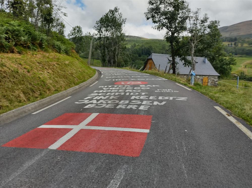 Ons oog valt tijdens de klim op de namen op de grond: supporters blijken zich te spiegelen aan het type renner waarvoor ze juichen. Beneden vinden we namen als ontsnappingsman Mattis Le Berre en sprinter Jonathan Milan. Hoe hoger we klimmen, hoe beter de berggeit op het asfalt. Misschien ontdekten we hiermee een nieuwe methode om het eindklassement te voorspellen, want de hoge eindnotering van Jordan Jegat in 2025 lees je hier simpelweg al van de tarmac af.