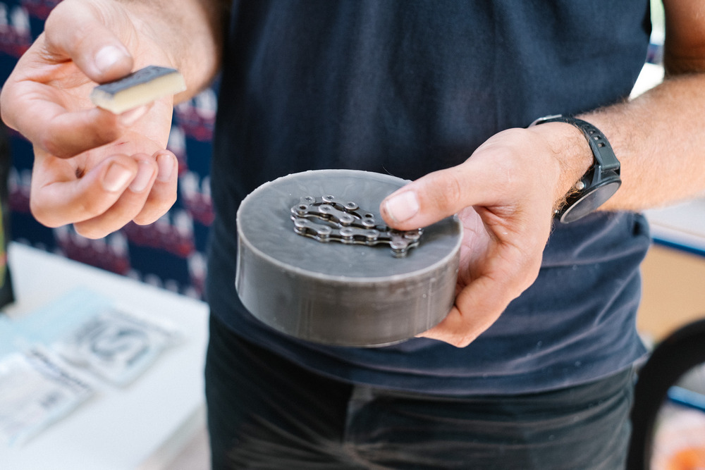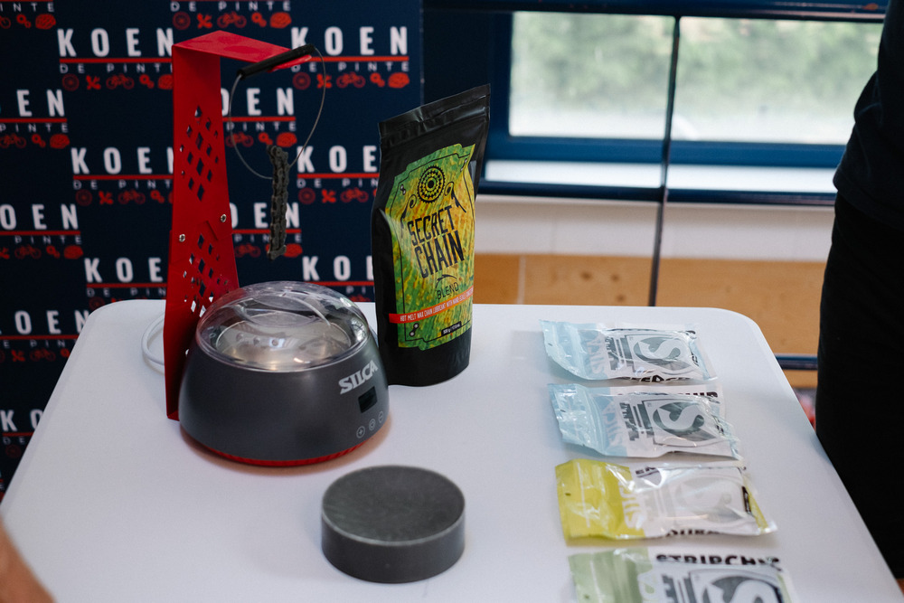 In Gent nam Fietsen Koen, verdeler van Giant en Factor Bikes, verschillende wax-opties onder de loep. Hij kwam tot dezelfde conclusie als Zerofrictioncycling en ging op zijn beurt in zee met Silca. Al relativeert zaakvoerder Jurgen Van Droogenbroeck de wax-hype ook wel enigszins. “Het is ook een beetje een hype, natuurlijk. Het is niet dat een geoliede ketting nu waardeloos is. In een perfect homogene, niet vervuilde omgeving zou fijne olie, zoals bijvoorbeeld Ceramic Speed UFO Drip, ook erg efficiënt zijn. Maar in de praktijk heb je die perfecte omstandigheden de facto alleen in een labo. Zelfs indoor, op de piste, heb je contaminatie: vocht, stofdeeltjes, minuscule partikeltjes die loskomen door de wrijving tussen kamwiel en ketting. Na 10 minuten is je perfect homogene omgeving om zeep.”