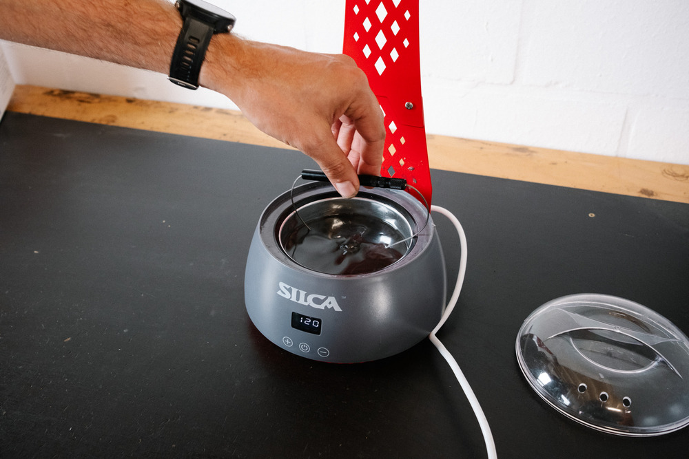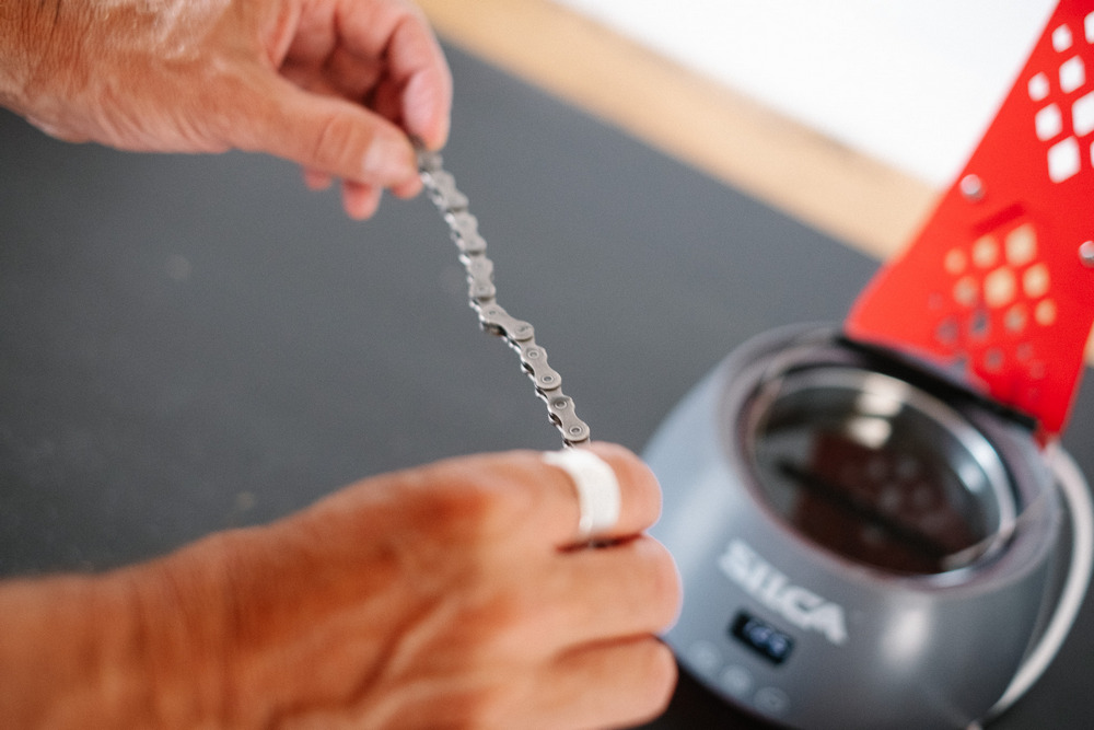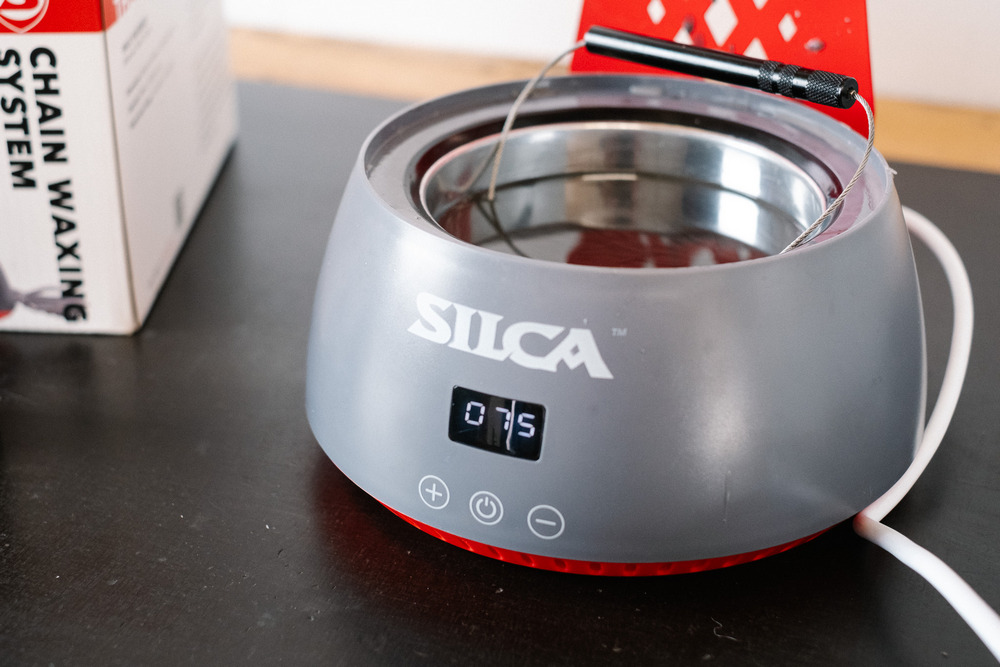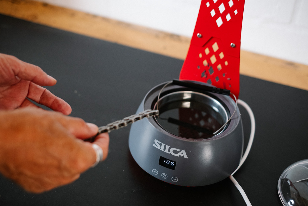 - Strip Chip: vóór je begint met waxen, moet je je ketting volledig ontvetten. De Strip Chip is Silca’s elegante oplossing: een geconcentreerde ontvetter die je opwarmt. Je dompelt de ketting onder, laat ze 10 minuten weken, borstelt indien nodig lichtjes na, en klaar. De ketting is daarna 100% klaar voor verdere behandeling.