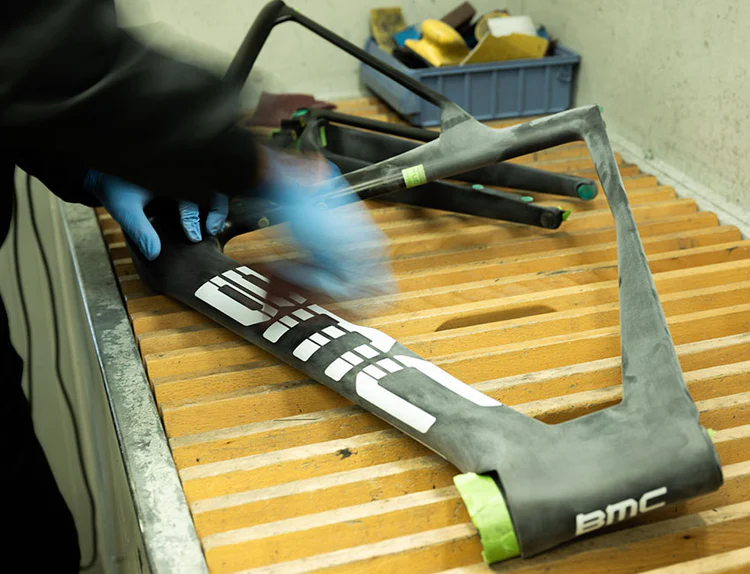 De frames zijn opgebouwd met hetzelfde 01-level carbon layup als de reguliere topmodellen. Daaroverheen is een ultradunne, transparante PU-coating aangebracht. Die laag maakt het frame direct rijklaar, maar dient ook als bescherming én als basis voor verf. Het resultaat: de lichtste visuele afwerking in de BMC line-up, waarbij de natuurlijke carbonstructuur zichtbaar blijft.