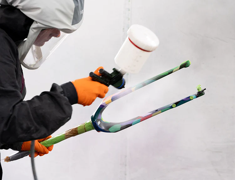Een groot voordeel van VAR0 is dat het frame direct geschikt is om te spuiten. In tegenstelling tot sommige andere frames hoeft er niet diep geschuurd te worden – een lichte scuff volstaat om verf te laten hechten. De aanwezige merkstickers liggen bovenop de PU-laag en kunnen eenvoudig verwijderd en vervangen worden.