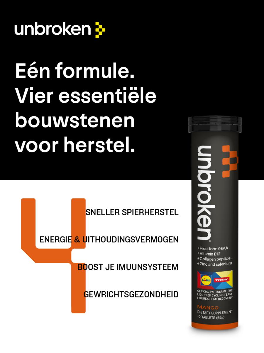 Dat is belangrijk, want als atleet leg je toch een hoge druk op je lichaam. Atleten letten heel bewust op hun voeding en zullen het schone, natuurlijke en geteste product op prijs stellen. Smaakt Unbroken naar vis? Integendeel! “Het onderscheidt zich juist door zijn zuivere, natuurlijke smaak. We gebruiken uitsluitend hoogwaardige natuurlijke fruitsmaken en stevia als zoetstof, met favorieten van zoete appel tot frisse lemon lime, het best ijskoud geserveerd. Er worden geen kunstmatige ingrediënten toegevoegd en het conserveermiddel is organische maltodextrine. Elke batch wordt getest door Informed-Sport®, zodat professionele teams zoals Lidl-Trek het product met volledig vertrouwen kunnen gebruiken. Unbroken is een zuiver, betrouwbaar supplement op basis van volwaardige voeding. Het is ontwikkeld voor topsporters, maar geschikt voor iedereen die waarde hecht aan prestaties en herstel.”