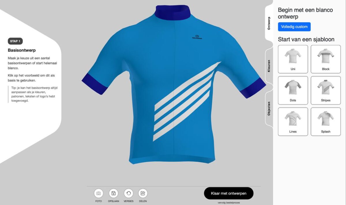 Wie de nieuwe configurator opent, merkt direct het verschil. Standaard tools dwingen jou als gebruiker vaak in een lineair proces. Kies een item, kies een kleur, voeg een logo toe, en klaar. De aanpak van Tex.vision is fundamenteel anders. Het ontwerp is hier een iteratief proces. Je kan starten met een volledig blanco doek, waarbij je vrij bent om te tekenen, kleuren te combineren en vormen te creëren die de identiteit van jouw eigen team vangt. Een andere optie is het aanpassen van een bestaand ontwerp. Misschien wil je een succesvol design van vorig jaar een frisse toets geven, een sponsorlogo toevoegen of de kleurtinten subtiel wijzigen.