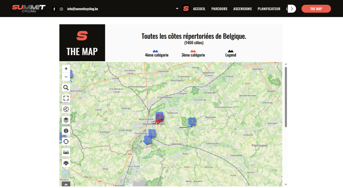 Het kloppend hart van Summit Cycling is de interactieve kaart met Belgische beklimmingen. Vandaag bevat die 1.460 beklimmingen, verspreid over het hele land en samengebracht op 1 enkele kaart. Van de Ardennen tot de Condroz, van het Land van Herve tot de Vlaamse Ardennen. De volledige rijkdom van het Belgische reliëf is in 1 oogopslag zichtbaar, zonder te moeten schakelen tussen verschillende platformen.