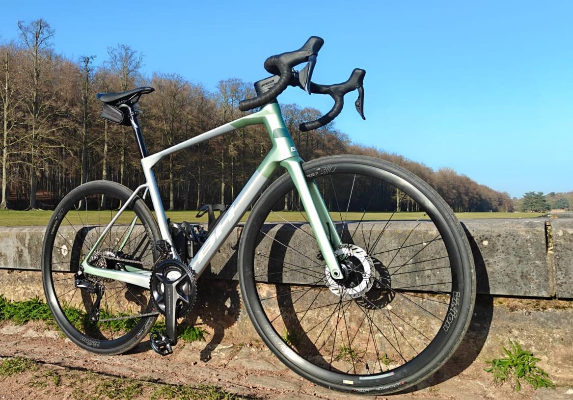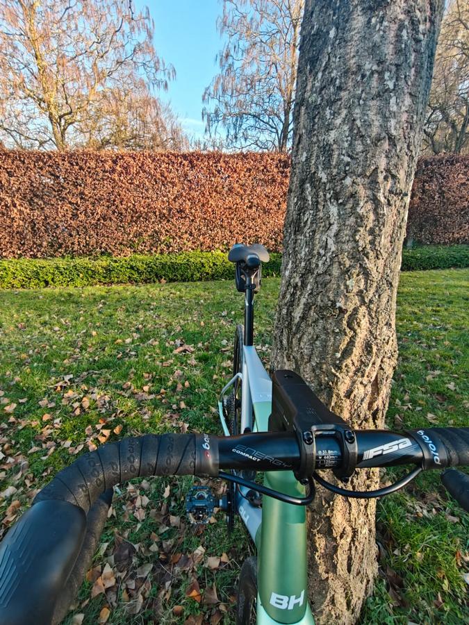 Wij gingen een paar weken met deze machine de hort op. Wat meteen opvalt, is het leuke design. Voor ons staat plots een volledig carbon fiets waarvan de voorvork, het voorste deel van het frame en het uiteinde van de achtervork gelakt zijn in een fris lichtgroen. De rest van het frame gaat gehuld in een glinsterende grijze kleur, vergezeld door een wit logo. Onder het motto ‘het oog wil ook wat’ zitten we hier absoluut goed. BH voorziet nog 2 designs: een witgrijs model en een donkere grijszwarte variant.