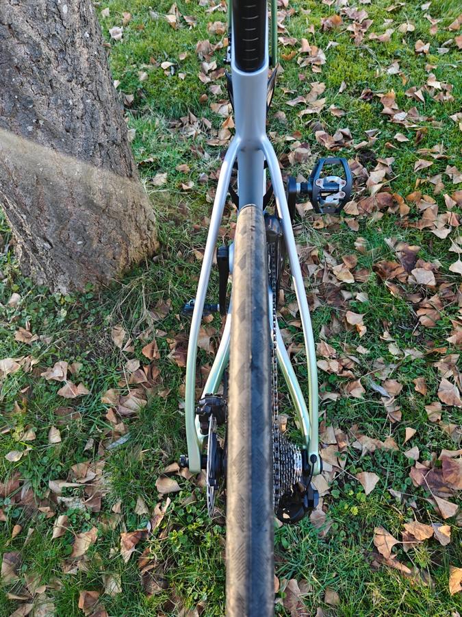 Verder springt ook de balhoofdbuis in het oog. Deze is, volledig volgens huidige trends, boven- en onderaan hoekig en sluit mooi aan bij de voorvork. Ook het contrast tussen de toch best dikke onderbuis en smalle, elegante bovenbuis valt op. Tussen die bovenbuis, de zitbuis en ronde zadelpen wordt een kleine driehoek gemaakt waarin de zadelklem verstopt zit. Net daaronder vertrekt de seatstay. Deze is bijna loodrecht vastgemaakt aan de zitbuis en buigt nadien af richting de steekas. Het verborgen 12mm Thru Axle Quick Lever-systeem (een uitschuifbaar hendeltje verstopt in de as) vereist geen gereedschap, biedt een strakke uitstraling en praktisch gebruiksgemak.